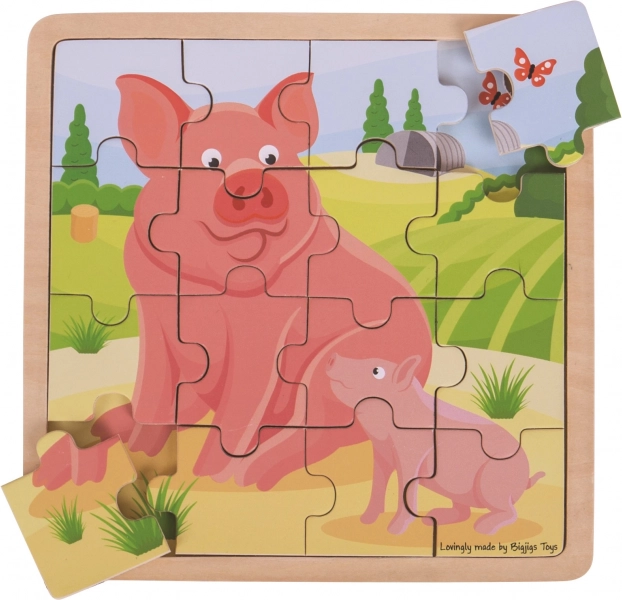 A kismalac első közös sétája anyukájával kedves jeleneten, amely első pillantásra magával ragadja a gyerekeket. A 16 darabos puzzle keretben, háttérmintával érkezik, így a kezdő kirakók gyorsan eligazodnak, és átélhetik a siker örömét. Az elemek elég nagyok és kellemes fogásúak a kis kezek számára.
