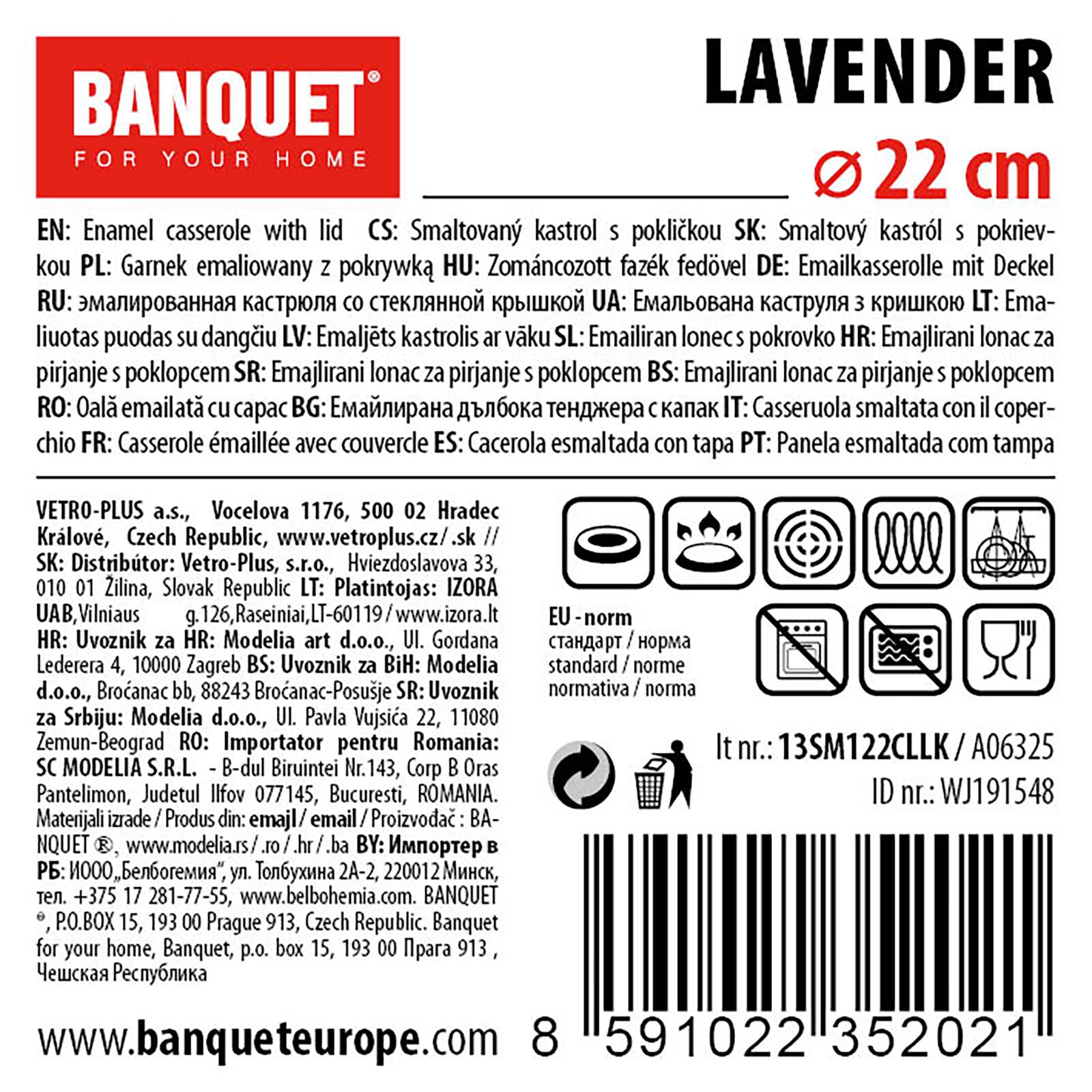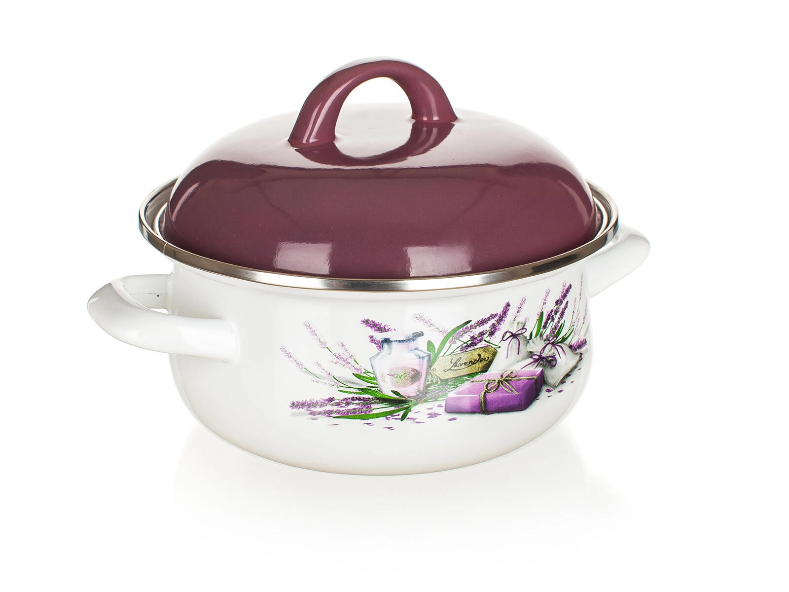 Elegáns, Lavender mintájú zománcozott lábas 22 cm átmérővel és 2,9 l űrtartalommal, ideális a mindennapi főzéshez. Magas fedővel lila színben, fehér mázzal és dekoratív nyomattal, valamint alkalmas minden típusú főzőlapra.