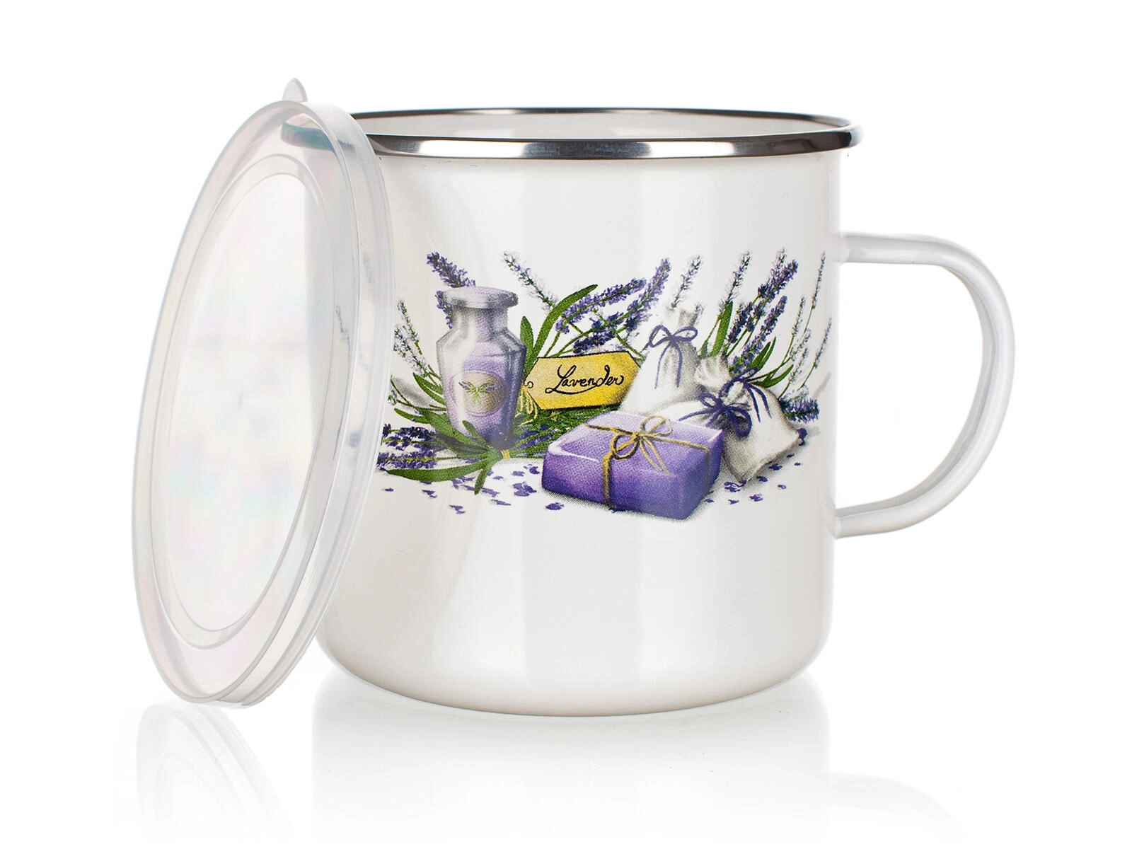 Elegáns, Lavender mintás zománcozott bögre 0,7 l űrtartalommal, meleg és hideg italokhoz egyaránt ideális. A műanyag fedélnek köszönhetően jobban tartja a hőt és segít megelőzni a kilöttyenést. A tartós, zománcozott kivitel könnyen tisztítható, és remekül használható a konyhában, a kertben vagy útközben is.