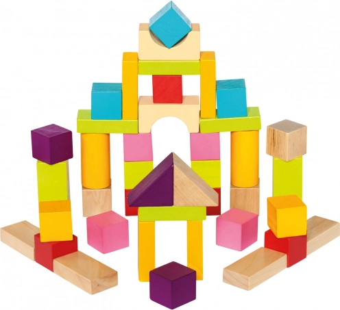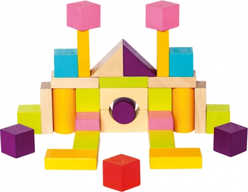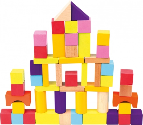 A változatos formáknak – kockák, hengerek, ívek és háromszögek – köszönhetően a gyerekek tornyokat, házikókat és fantáziadús építményeket alkotnak. A sima, igényesen megmunkált fa és a sokféle szín támogatja a érzékszervi fejlődést és a kreatív játékot.