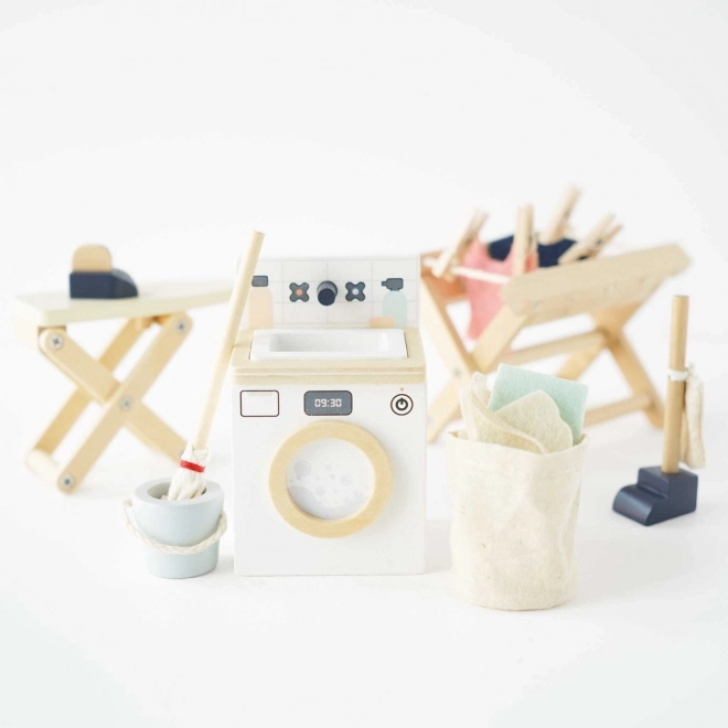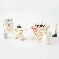 A mosókonyha bútorkészlet valósághű, mégis kreatív játékélményt nyújt. A fenntartható anyagokból készült, kiváló minőségű kidolgozás és a részletgazdag megjelenés hosszú élettartamot és szép összhatást biztosít bármely babaházban. A mosógép, szárító vagy vasaló jellegű kiegészítőknek köszönhetően a gyerekek fejlesztik finommotorikájukat és koordinációjukat, valamint a képzelőerejüket.