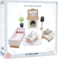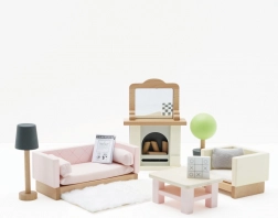 A készlet 19 részből áll: kanapé és fotel textil párnákkal, dohányzóasztal, kandalló fahasábokkal és tükörrel, szőnyeg, virág cserépben és lámpa. Méretben illeszkedik a Le Toy Van babaházaihoz. A Daisylane kollekció további kiegészítői elérhetők weboldalunkon.