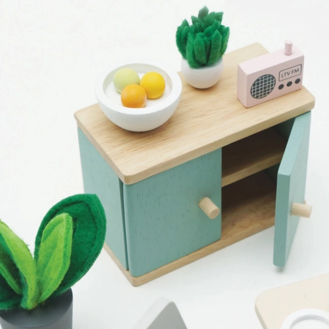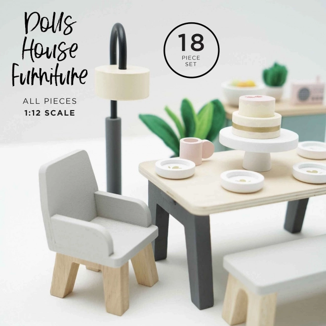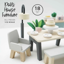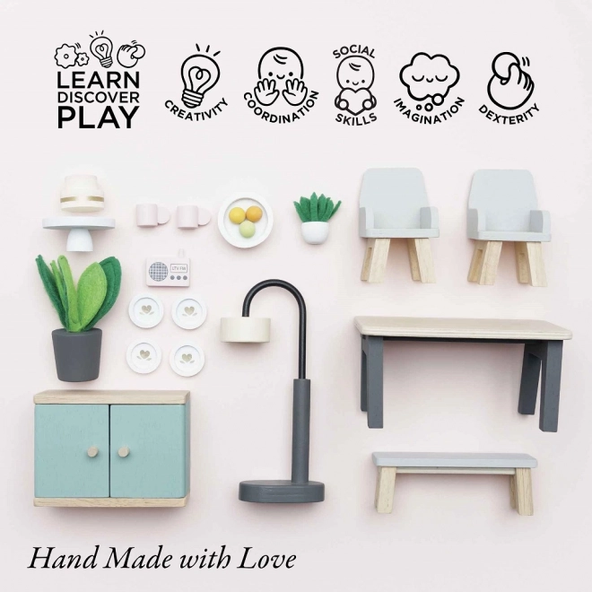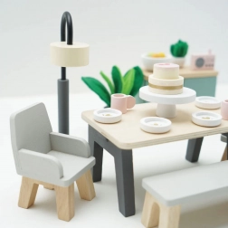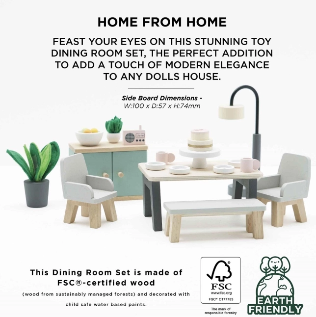 Ez a bájos étkező szett kiváló minőségű FSC tanúsítvánnyal rendelkező fából készült, és minden babaházba egy kis kifinomultságot visz. 18 elemet tartalmaz, beleértve az asztalt, két széket, a padot, a lámpát, a kredencet és dekoratív kiegészítőket, mint növények, gyümölcsös tál és torta. Ez a készlet nemcsak szépen néz ki, hanem fejleszti a gyerekek kognitív és kommunikációs képességeit is. Nem toxikus, vizes bázisú festékekkel dekorálva kompatibilis más Le Toy Van Doll házakkal is.