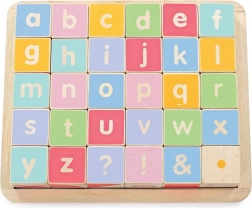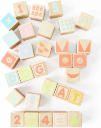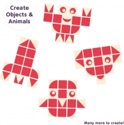 A kockák és a tárolóalap lekerekített élei kényelmes és biztonságos használatot biztosítanak. A játék műanyagmentes, FSC tanúsítvánnyal rendelkező fából készül, etikus gyártással és fenntarthatósággal a középpontban. A készlet támogatja a kognitív készségek, a térbeli képzelőerő és a nyelvi képességek fejlődését.