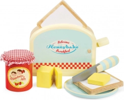 - Teljes reggeliző szett: rugós kenyérpirító, 2 kenyérszelet, tépőzáras vaj, kés, tányér és lekvár.