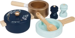 A fedős lábas, a nyeles lábas, a serpenyő és a fa kiegészítők ösztönzik a kreatív játékot és a valódi főzés utánzását.