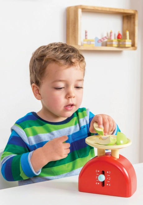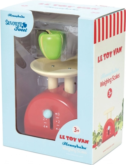 A LE TOY VAN Honeybake kollekció stílusos fa konyhai mérlege tökéletes kiegészítő a gyerekkonyhába vagy boltos játékhoz. Az okos, mozgatható karnak köszönhetően realista mérlegelést kínál, kézzel utófestett vízbázisú, nem mérgező festékekkel, és a készlet része két félbe vágható alma tépőzárral a végtelen játékszcenáriókhoz.
