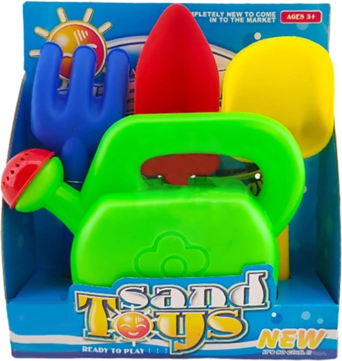 Színes gyermek kerti készlet kis segítőknek, amely tartalmaz egy ültetőkanalat, lapátot, gereblyét és egy locsolókannát. A könnyű és tartós polipropilén ideális a kerti és homokozós játékhoz, fejleszti a finommotorikát és a természet iránti kapcsolatot.