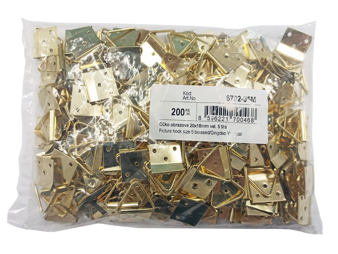 Képakasztó szem 20 × 18 mm 5-ös méretben, tartós sárgarézből, ideális képek és fényképek falra akasztásához. A praktikus 200 db-os csomag megkönnyíti több keret felszerelését, és biztosítja az erős, biztonságos rögzítést.