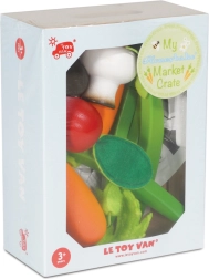 A szett 9 részletgazdag zöldségelemet és egy márkajelzéssel ellátott fa ládikát tartalmaz. A játék a díjnyertes Honeybake kollekció része, amely az kognitív készségeket, a szociális interakciót és a nyelvi fejlődést fejleszti utánzó játék révén.