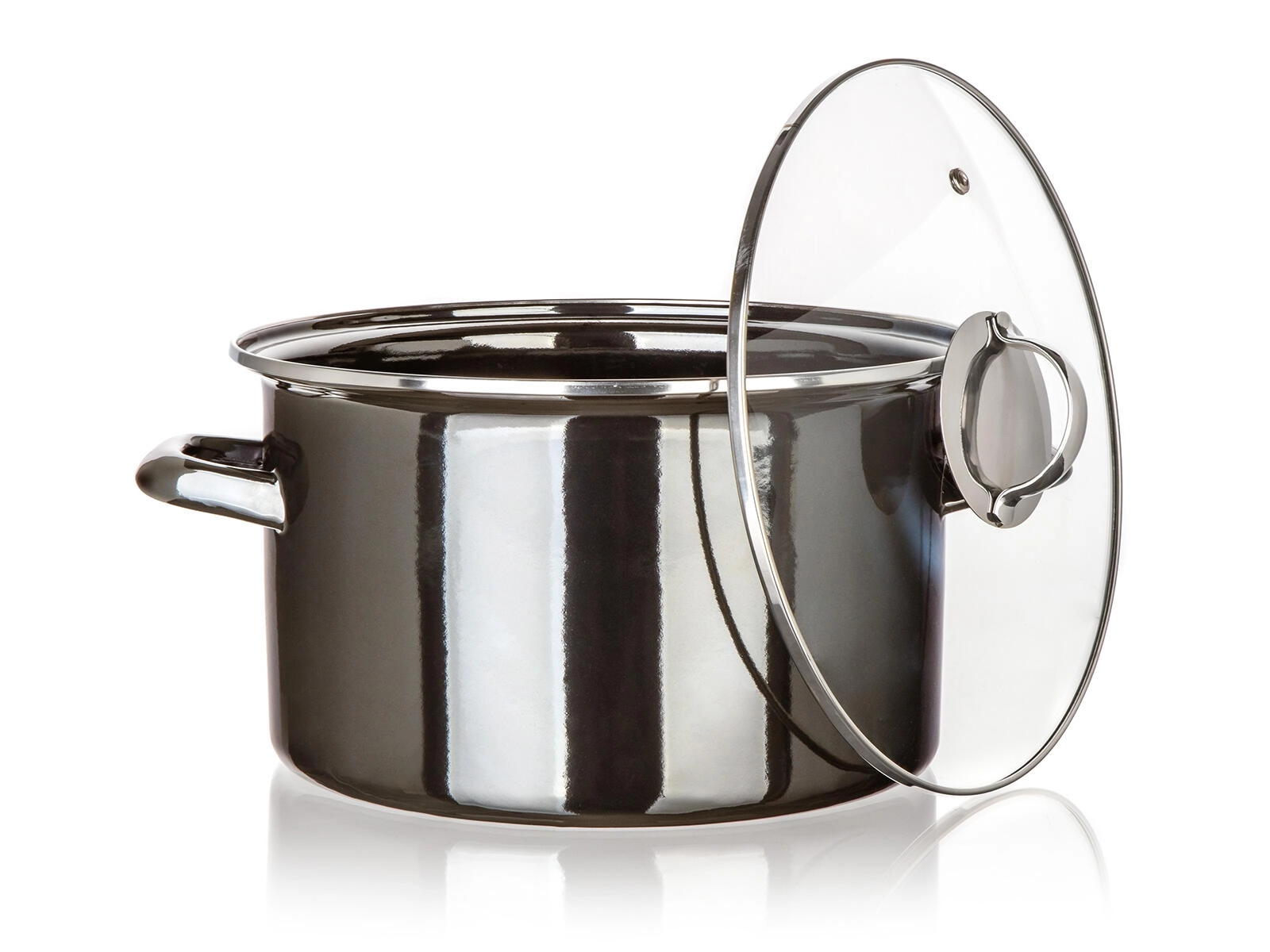Fedezze fel a megbízható zománcozott fazekat, amely a klasszikus megjelenést modern funkcionalitással ötvözi. A fekete metálfény stílust kölcsönöz konyhájának, míg a üveg fedő lehetővé teszi a főzés ellenőrzését felesleges leemelés nélkül. A 6 l űrtartalomnak köszönhetően kényelmesen elkészíthet kiadós leveseket, alapleveket és családi adag párolt ételeket.