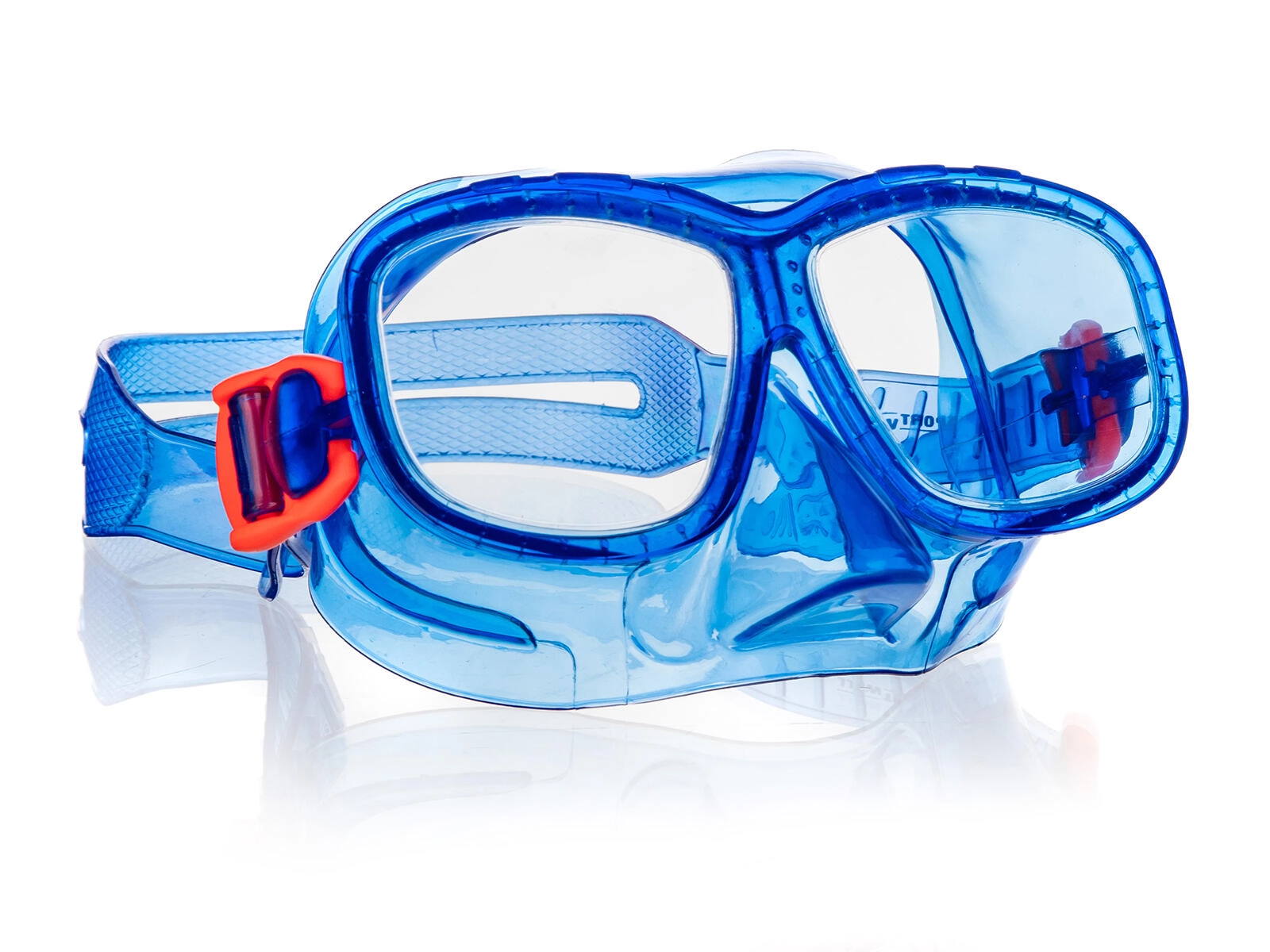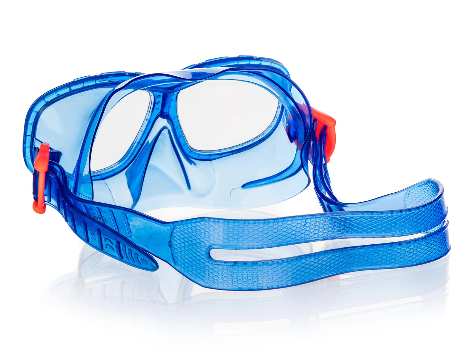 Az osztott, tartós polikarbonát látómező tiszta víz alatti rálátást biztosít, és jobban védi a kis úszók szemét.