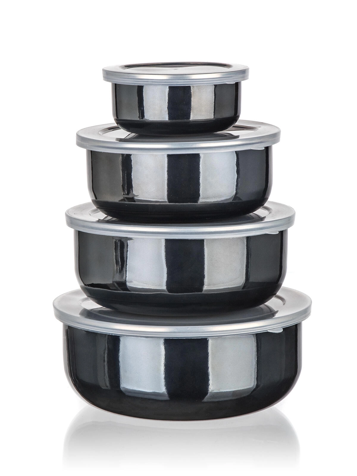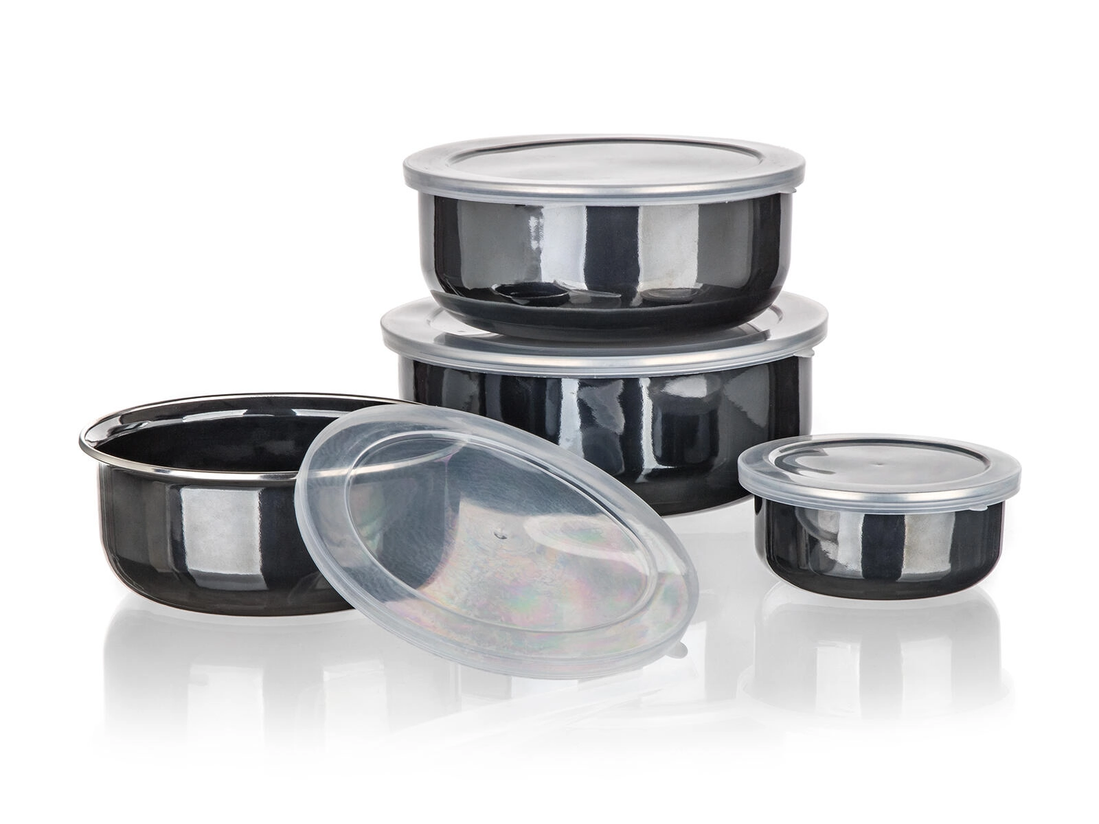Praktikus METALIC Black zománcozott tálkakészlet műanyag fedőkkel, elegáns fekete színben, mindennapi használatra. Négy méret egymásba rakható kialakítással helyet takarít meg, a tömítő fedők tovább frissen tartják az ételeket, a tartós zománc pedig megkönnyíti a tisztítást. Ideális élelmiszerek tárolásához hűtőszekrényben és útközben is.