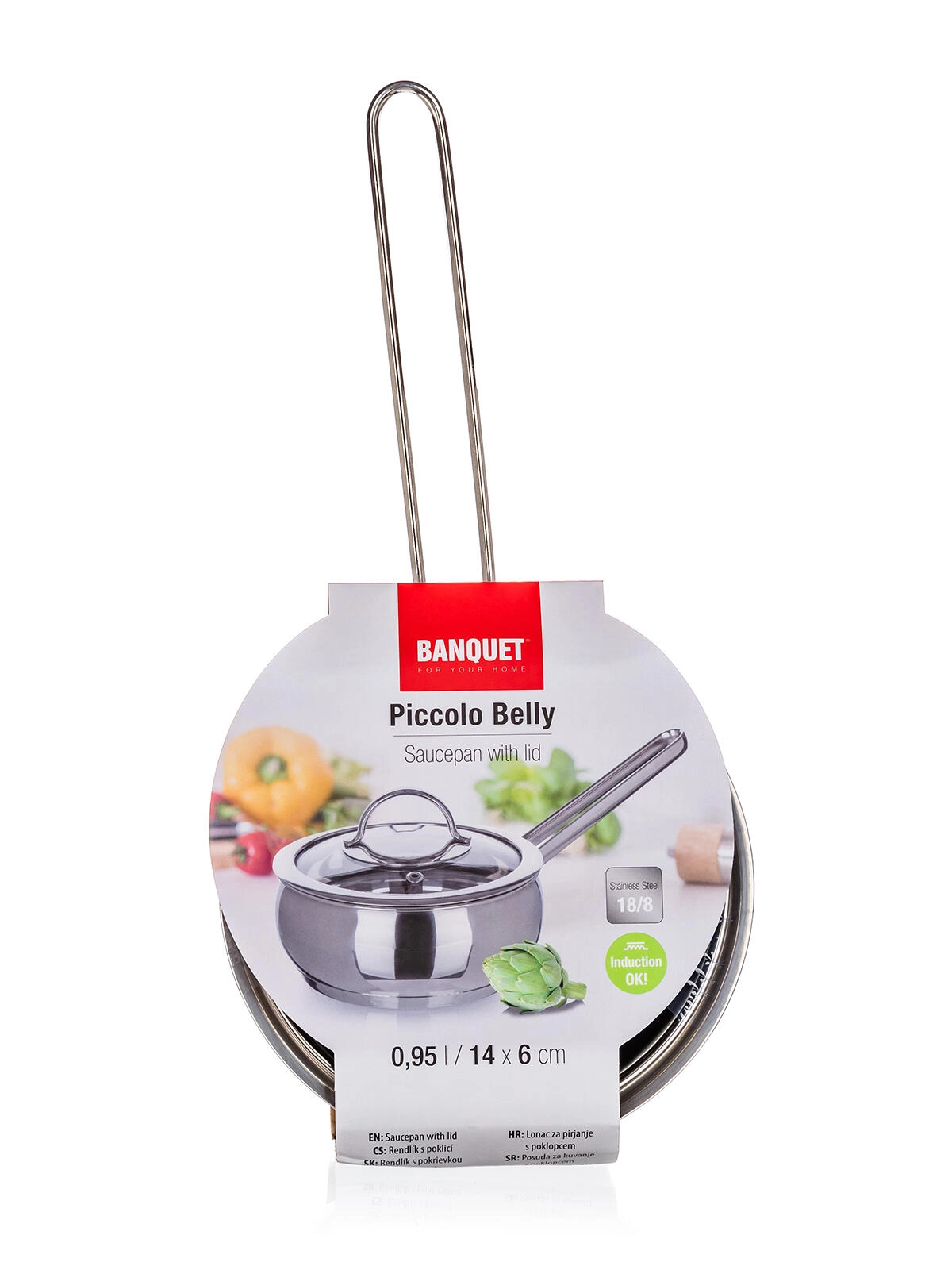 Kompakt PICCOLO Belly rozsdamentes nyeles lábas 0,95 l űrtartalommal és 14 cm átmérővel, ideális szószokhoz, melegítéshez és kisebb adagokhoz. Az üvegfedőnek köszönhetően főzés közben folyamatosan rálát, a 18/8 rozsdamentes acél pedig hosszú élettartamot és könnyű karbantartást biztosít. Alkalmas minden főzőlaphoz, beleértve az indukciót is.