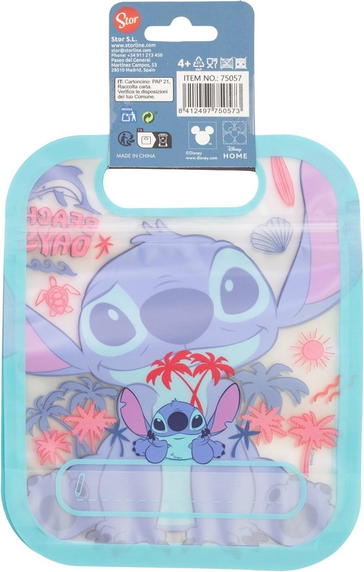 Játékos minta Stitch-csel és nyári ikonokkal, amely stílust ad minden csomagolásnak, és a gyerekek imádni fogják a tasakokat.