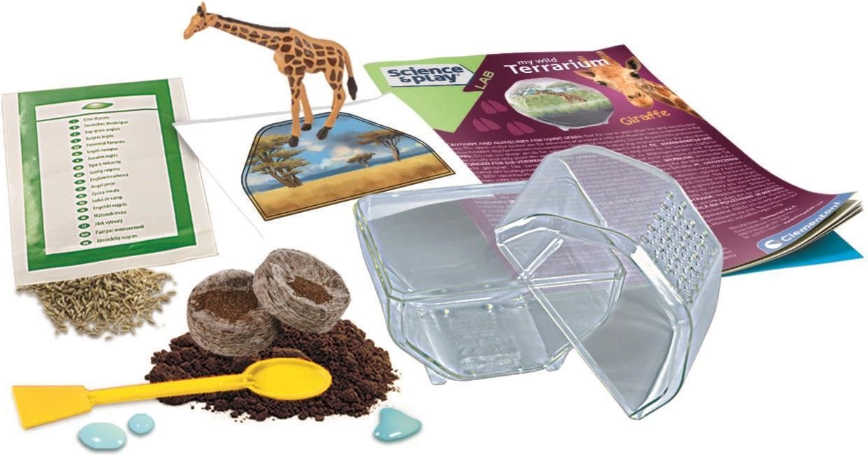 - Átlátszó terrárium szellőző fedéllel, talajpelletek, magok, lapátka, zsiráf figura, dekoratív háttér, útmutató