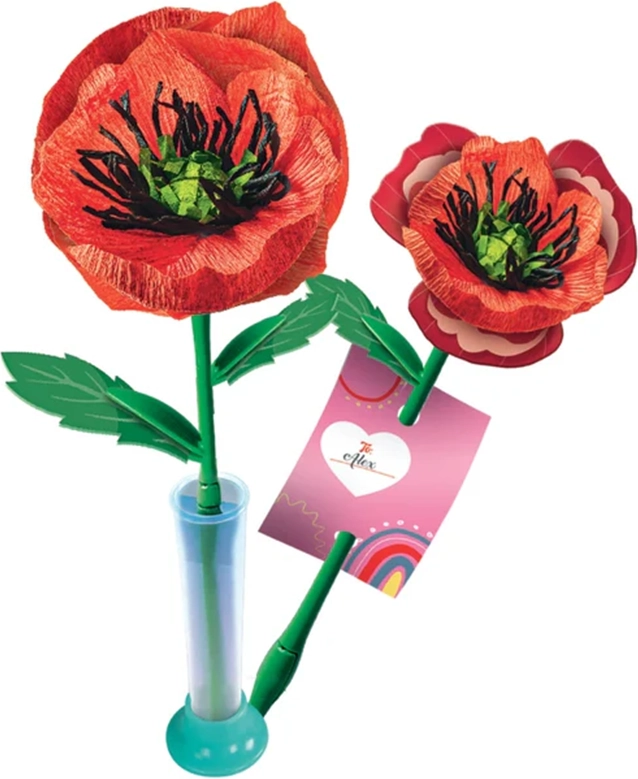 Kreatív készlet két virág elkészítéséhez, amely lehetővé teszi a gyerekek számára, hogy pipacsokat hajtogassanak, színezzenek és díszítsenek. A csomag tartalmaz szárakat, színezhető sziromlapokat, hajtogatható leveleket és virágtartókat, valamint egy ajándékkártyát tartóval. Ideális a képzelet, a finommotorika és a kreativitás fejlesztéséhez.