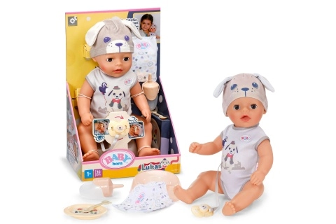 A bájos BABY born Lukas kutyus baba 36 cm-es méretben ideális első baba 1 éves kortól. 7 egyszerű, elemet nem igénylő funkcióval rendelkezik – iszik a cumisüvegből, sárga szívecske jelenik meg a pelenkán vízzel érintkezve, bilire ül, és a varázslatos cumival nyitja és csukja a szemét. A mozgatható karok és lábak, valamint a forgatható fej megkönnyítik az öltöztetést, és támogatják a realista játékot és a finommotorikát.
