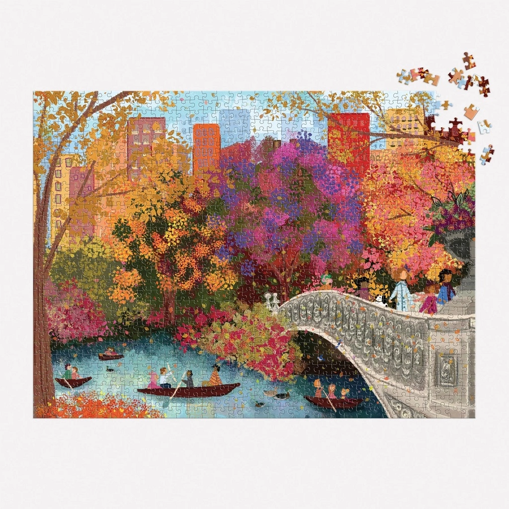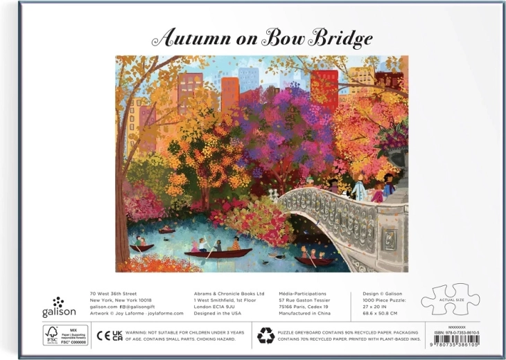 Élvezze New York varázslatos őszi hangulatát a GALISON puzzle-lel, melynek témája a Bow Bridge a Central Parkban, Joy Laforme illusztrációjával. 1000 precízen kivágott darab kínál kellemes kihívást, a gazdag színek és a részletgazdag nyomtatás pedig örömet szerez minden összerakásnál. Felelősen készül FSC tanúsítvánnyal rendelkező, újrahasznosított anyagokból, és nem mérgező festékekkel nyomtatva.