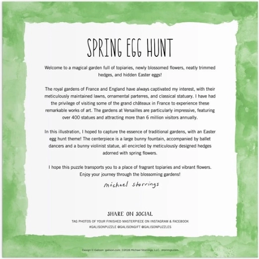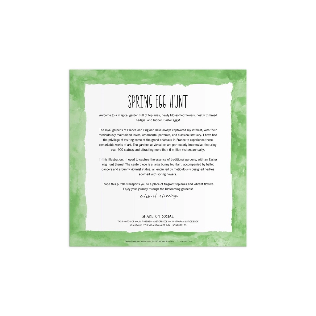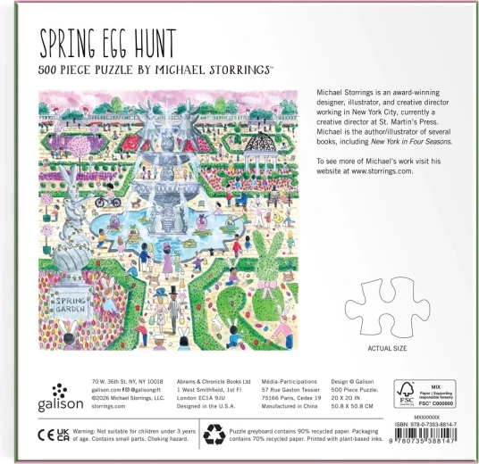 Fedezze fel a tavasz varázsát a Galison márka és az illusztrátor Michael Storrings dizájnos kirakójával. Ez a minőségi, 500 darabos puzzle egy elegáns, tavaszi kertet ábrázol, tele virágokkal, szökőkutakkal és vidám húsvéti tojáskereséssel. A precízen vágott elemek, a gazdag részletek és a élénk színek garantálják a kellemes kikapcsolódást és a közös családi szórakozást. FSC® újrahasznosított papírból készült, nem mérgező tintákkal nyomtatva.
