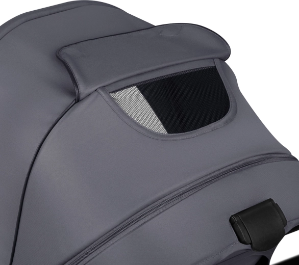 Széles, magasra helyezett mózeskosár, amelyben a baba lábzsákban is kényelmesen elfér. Többirányú szellőzés mágneses zárakkal a kellemes klímáért egész évben.