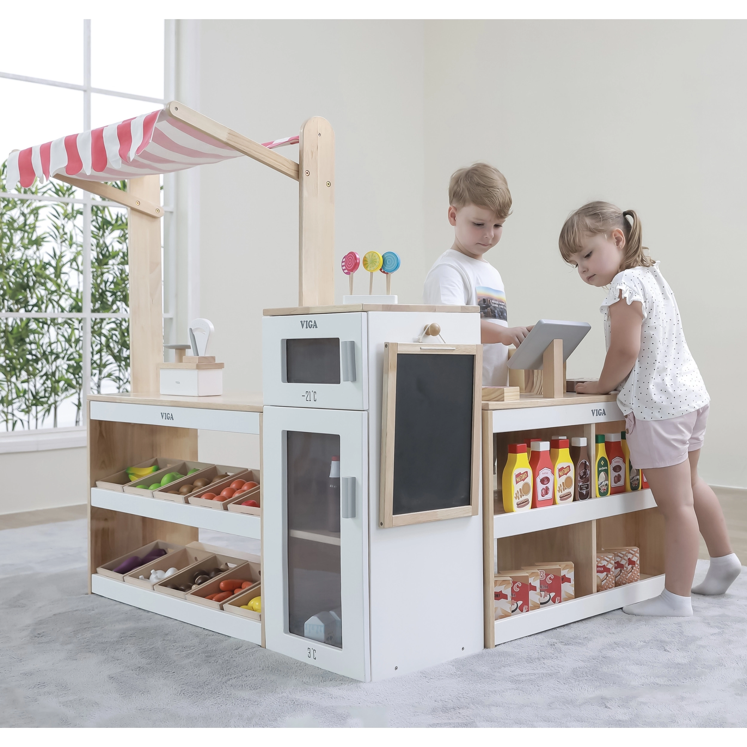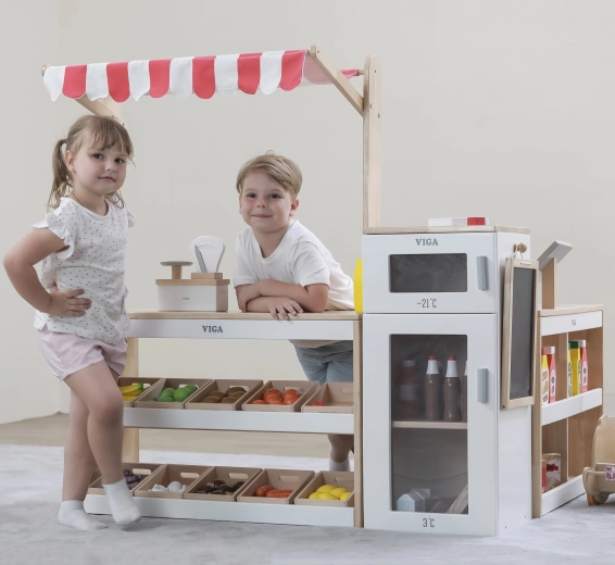 Fedezze fel a Viga XXL nagy fa játékkioszkot, amely a gyerekszobát fantáziával teli szupermarketté varázsolja. A valósághű kivitel pulttal, hűtővel fagyasztóval, krétatáblával és tároló kosarakkal ösztönzi a kreatív boltos–vásárló szerepjátékot, fejleszti a kommunikációt, számolást és az együttműködést. Biztonságos fából, nem mérgező festékekkel készül.