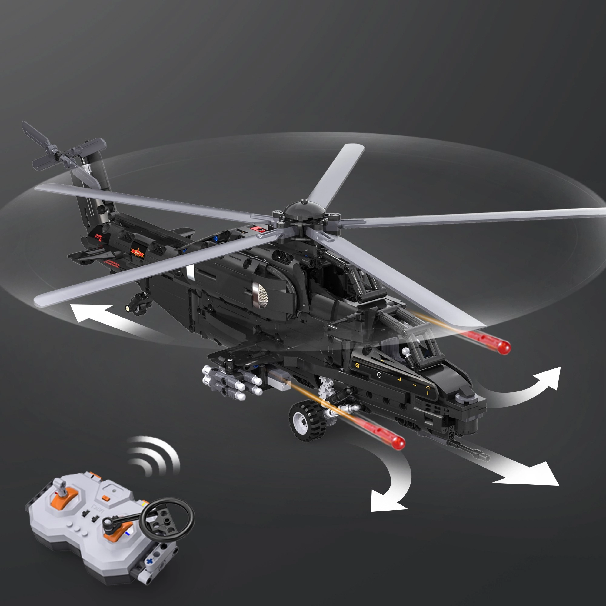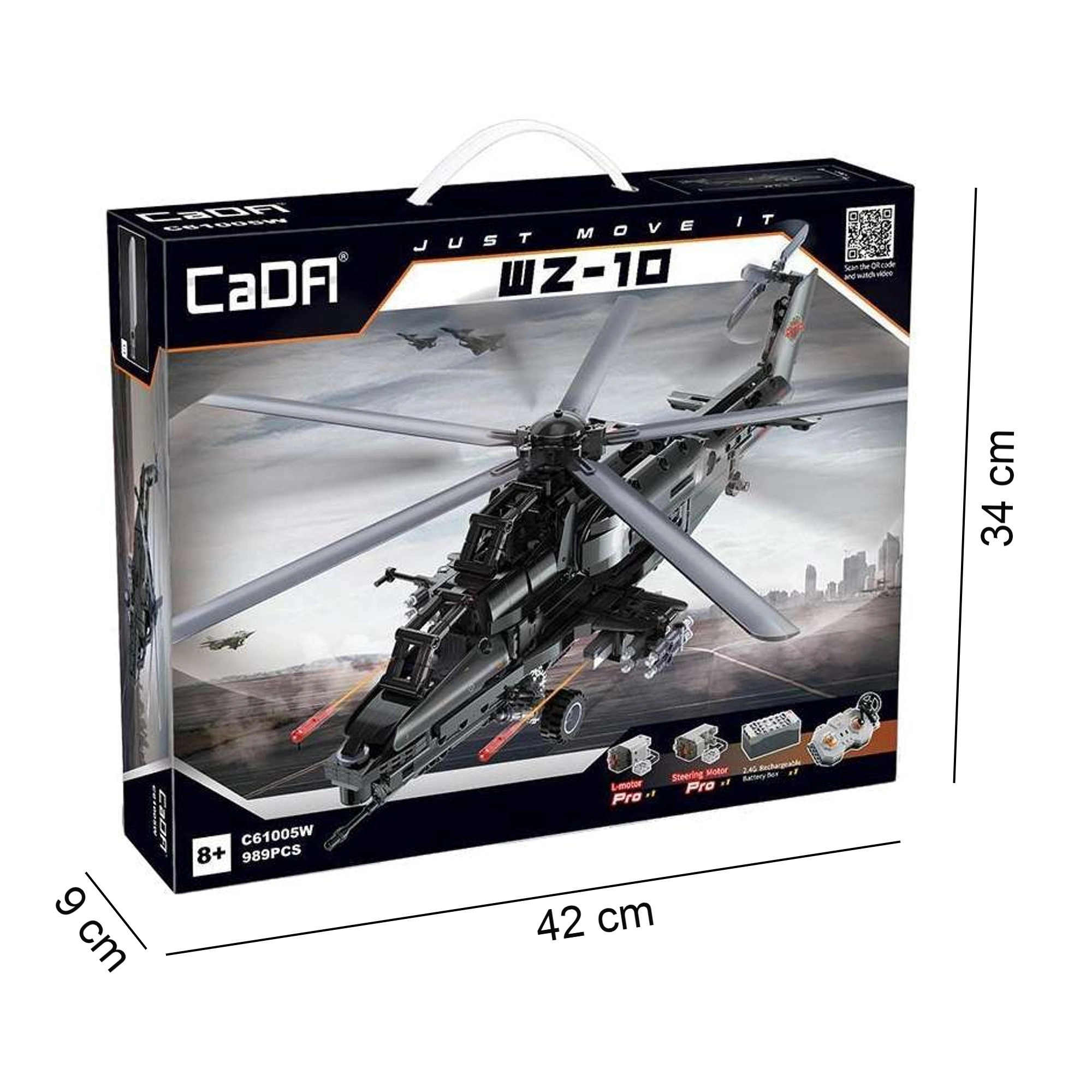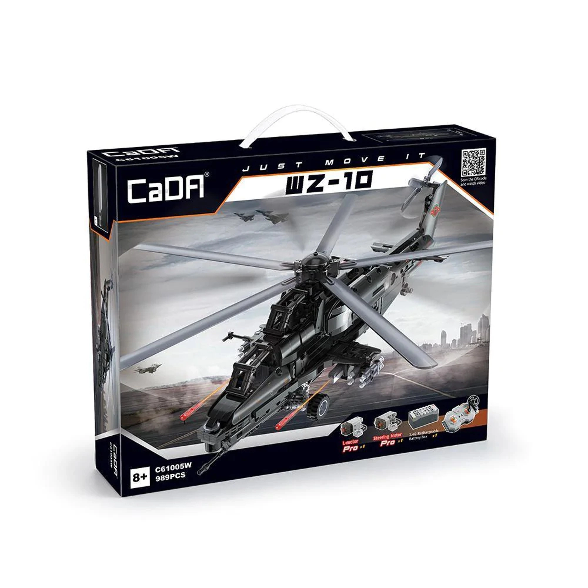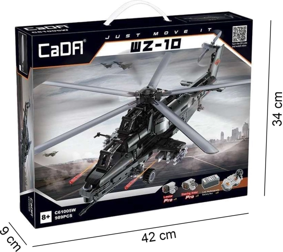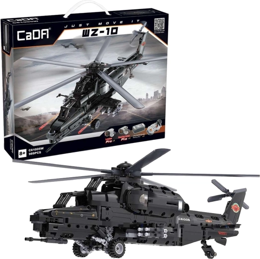 Építsd meg az ikonikus WZ-10 támadó helikoptert 989 alkatrészből a CaDA-tól, és irányítsd távirányítóval. A modell működő fő- és farokrotorral, nyitható pilótafülkével, működő rakétavetővel és guruló kerekekkel rendelkezik. A 2,4 GHz-es RC vezérlés 25 m feletti hatótávval rengeteg akciót és precíz technikai építési élményt kínál.