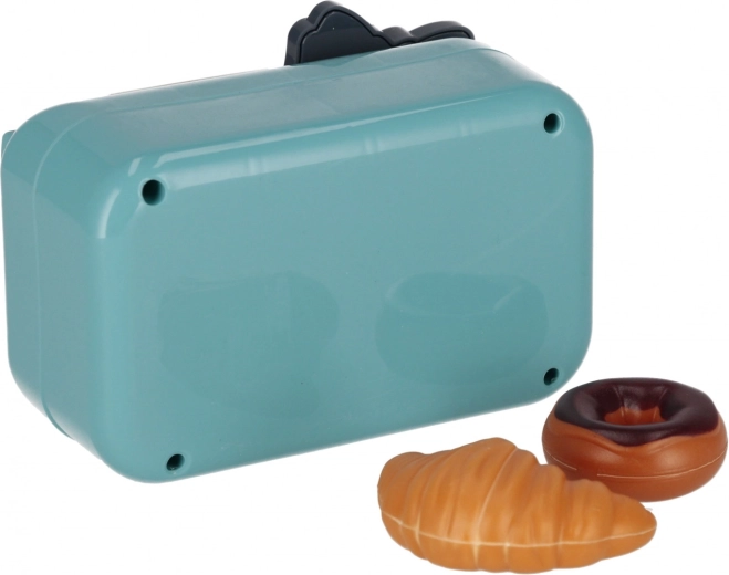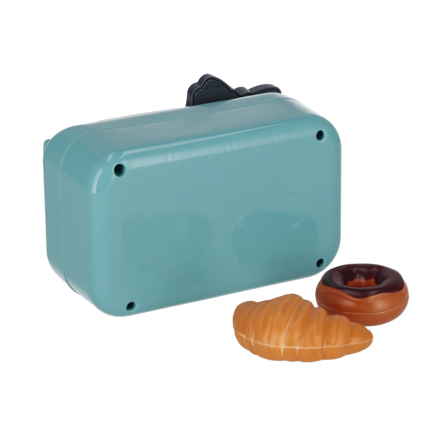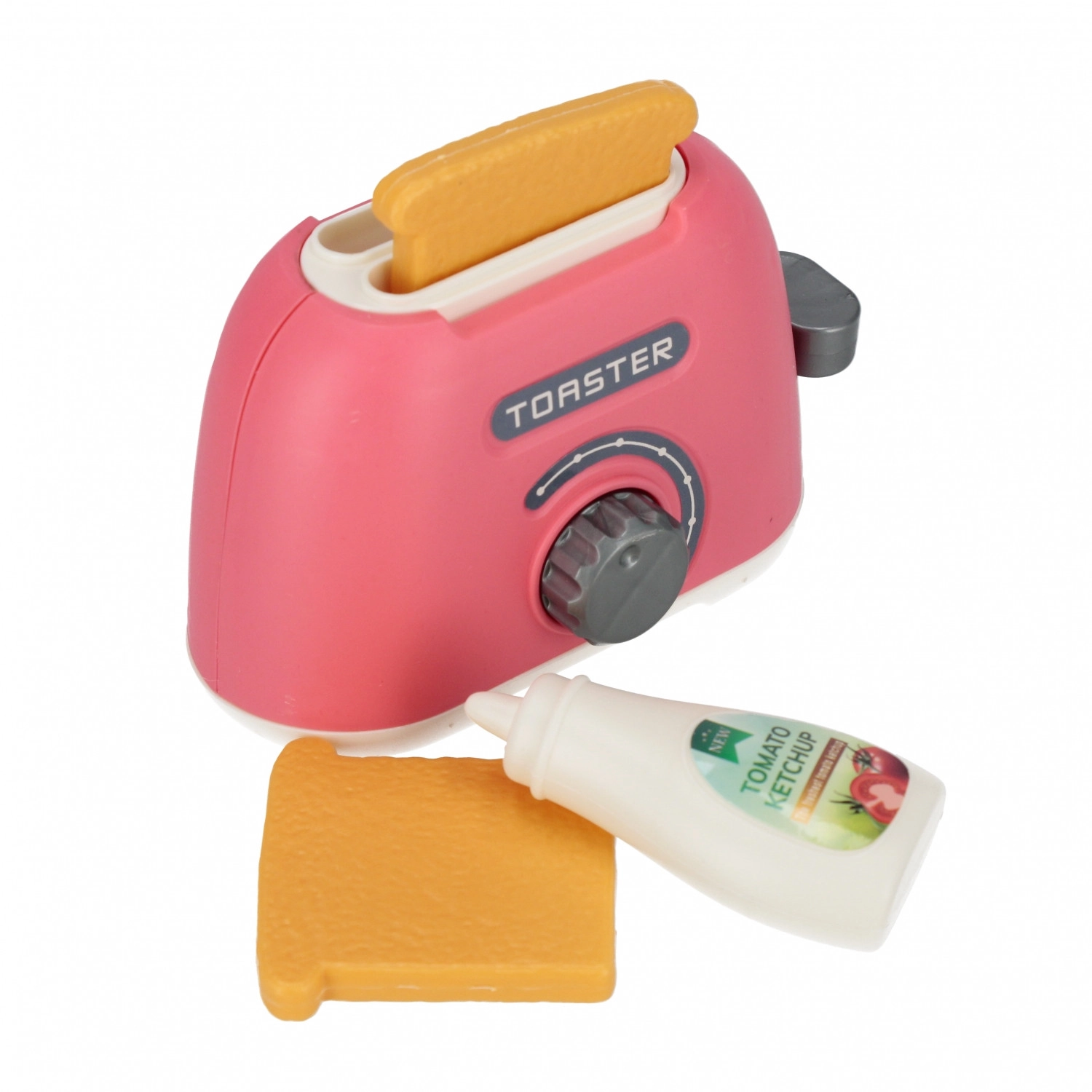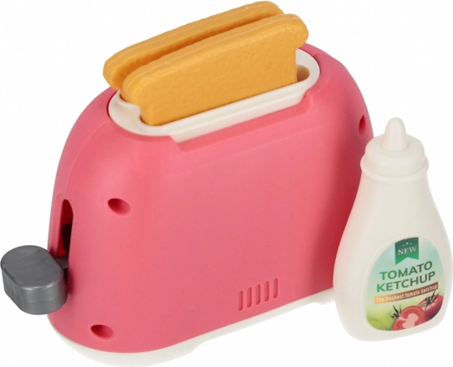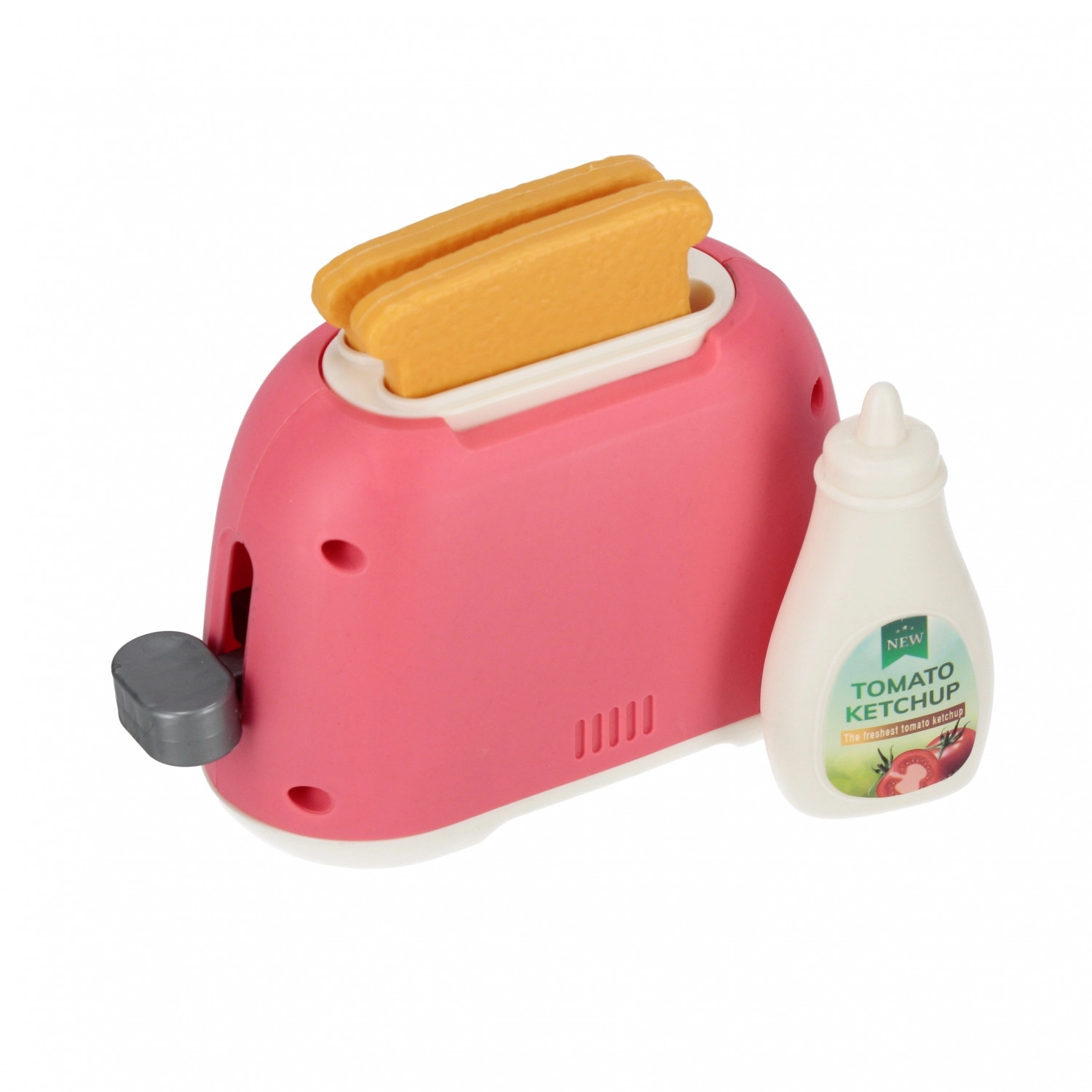 Kis rózsaszín pirító karos mechanikával és forgatható számlappal a „pirítottság” beállításához – tökéletes szakácsos játékhoz. Tartozék 2 szelet toast és egy ketchupos palack.