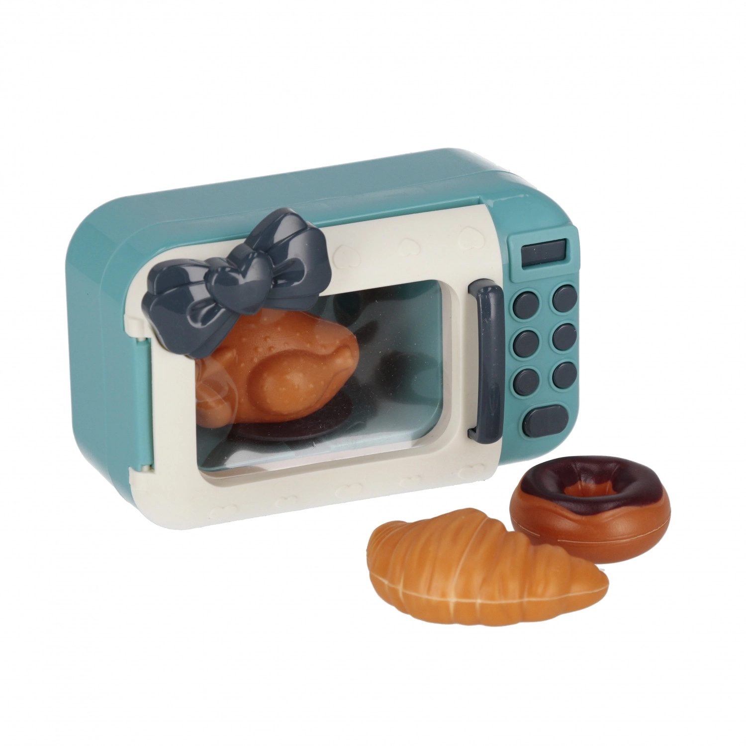 Aranyos mikrohullámú sütő átlátszó ajtóval és gombokkal. A gyerekek „melegíthetik” a kis csirkét, a croissant-t és az édes desszertet.