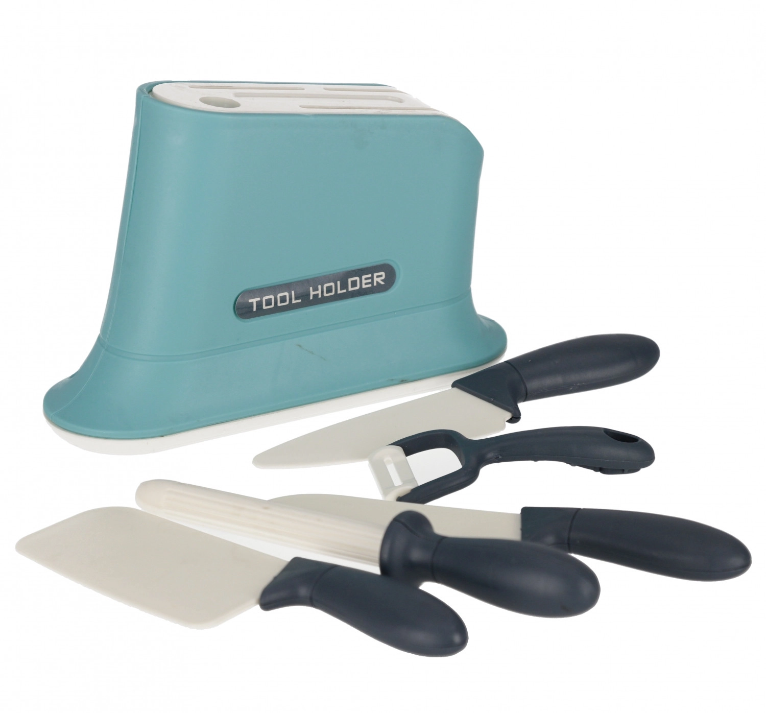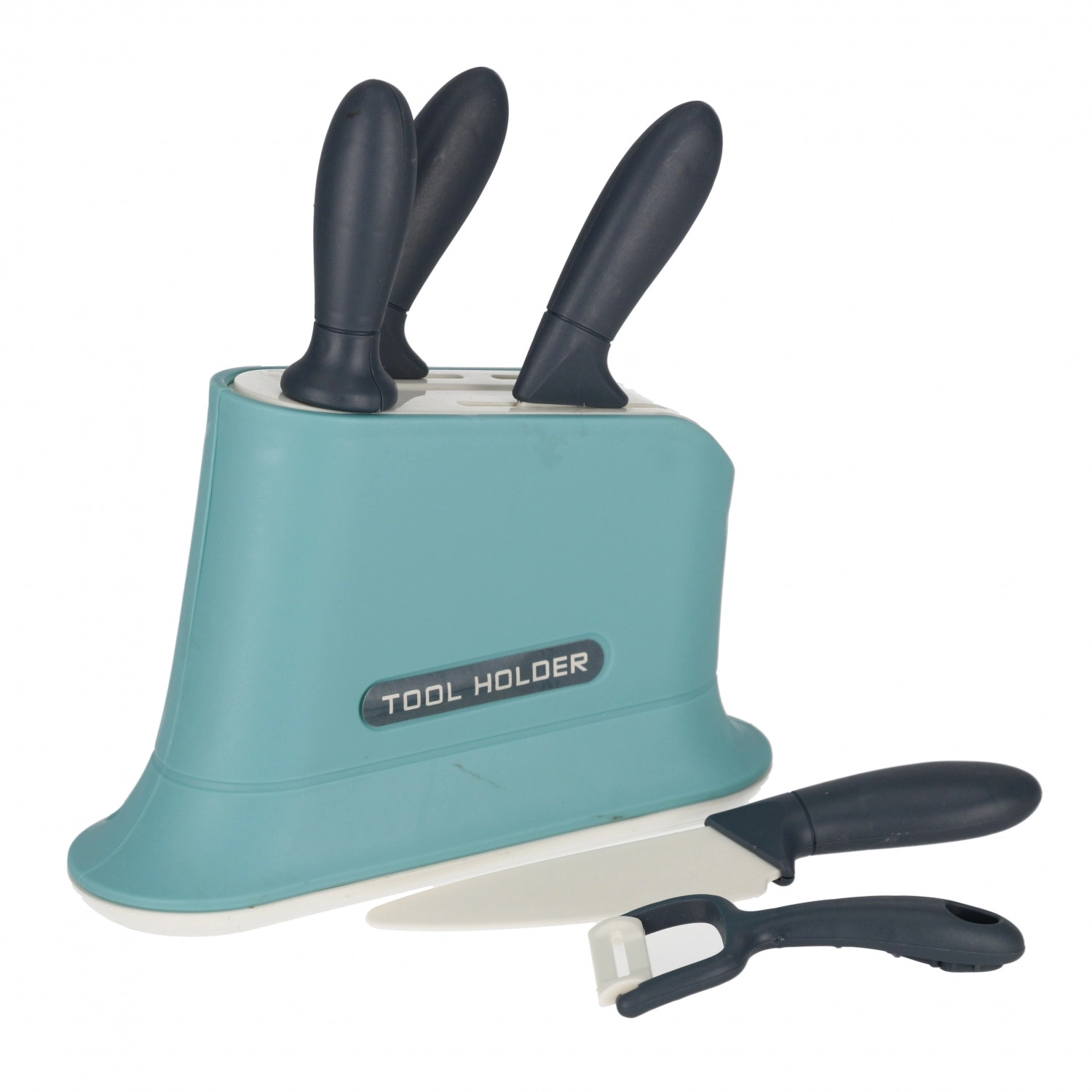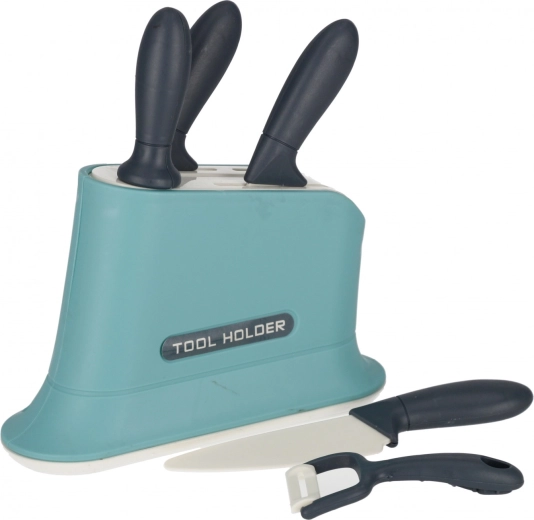 Biztonságos gyakorlókészlet kis szakácsoknak: eszköztartó, több kés és hámozó ergonomikus markolattal a kényelmes fogásért.