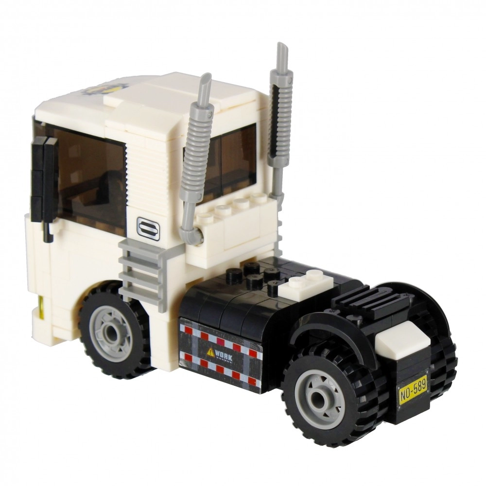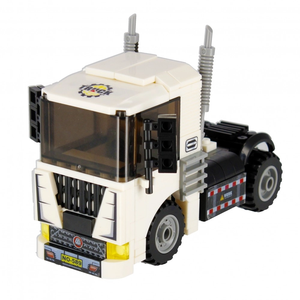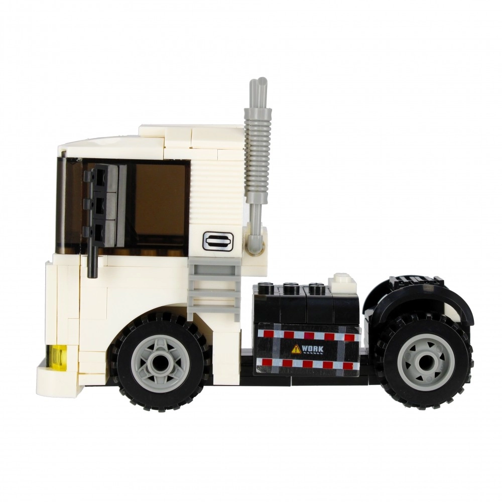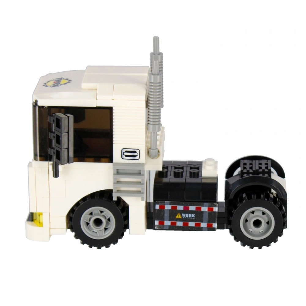 Építsen meg egy fehér nyergesvontatót működő kerekekkel, kipufogókkal és markáns fülkével. Ideális szállításhoz és építkezési jelenetekhez a városban.