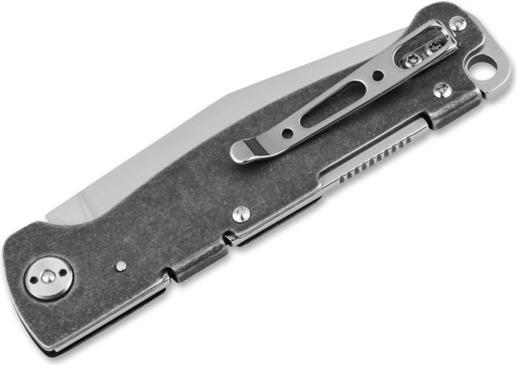 A penge körömvájattal történő, manuális nyitása intuitív és biztonságos, a zárt és nyitott helyzetben való biztos rögzítésről a masszív backlock zár gondoskodik. A teljesen fémből készült, rozsdamentes acél markolat sötét stonewash felülettel karcálló és elegáns megjelenésű. A praktikus zsebklipsz és a zsinórlyuk bővíti a hordási lehetőségeket a mindennapi tevékenységek során.