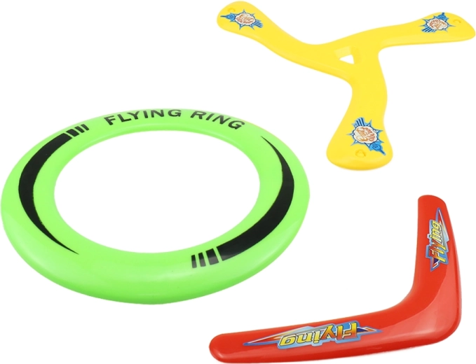 Ez az univerzális frisbee-készlet három különböző repülési stílust kínál a maximális élményért. A repülő gyűrű stabil és messzire száll, a klasszikus bumeráng visszatér, a hármas bumeráng pedig dinamikus és szórakoztató repülést biztosít. A feltűnő színeknek köszönhetően a korongok nagyobb távolságból is könnyen észrevehetők.