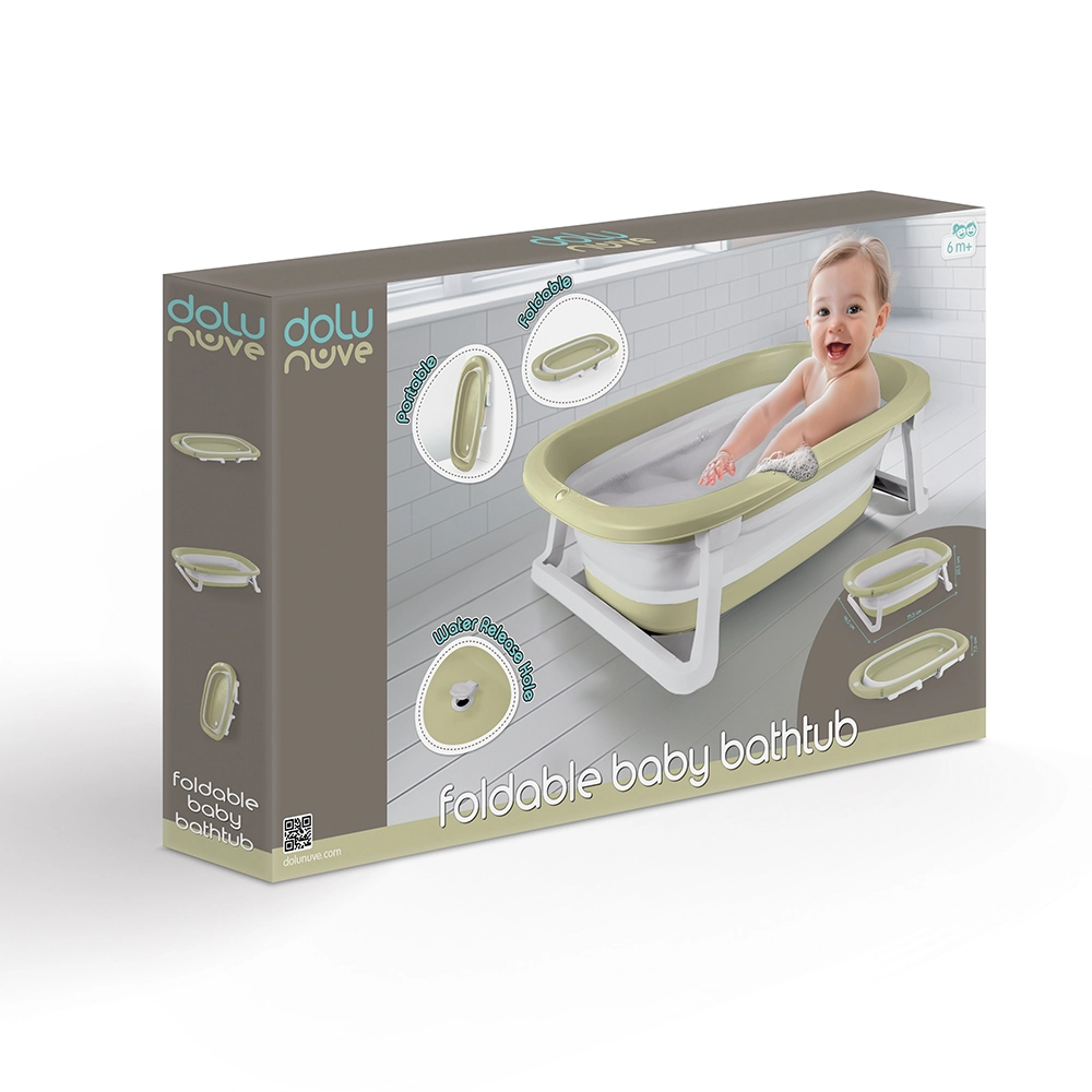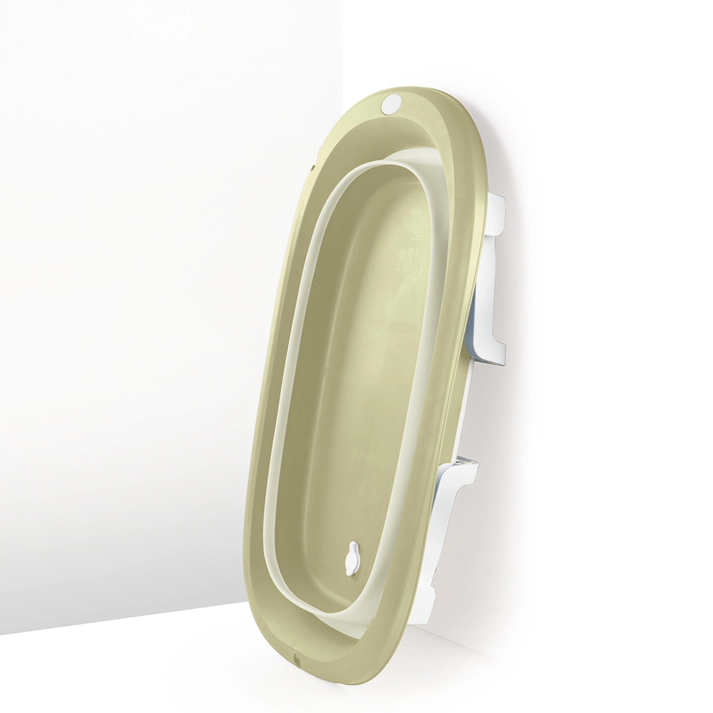 Praktikus, összecsukható babakád fehér és világoszöld színkombinációban, kényelmes fürdetéshez 6 hónapos kortól. A összecsukható kialakítás helyet takarít meg, stabil lábakkal, zárható leeresztő dugóval az egyszerű vízleeresztéshez, és tartós műanyag anyagokból készült elegáns dizájnnal.