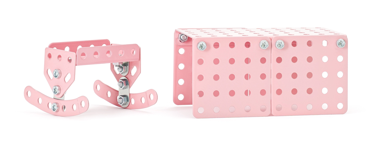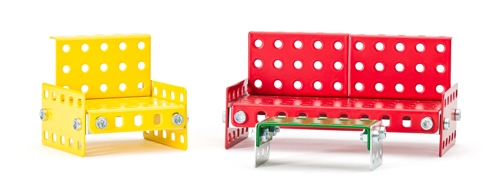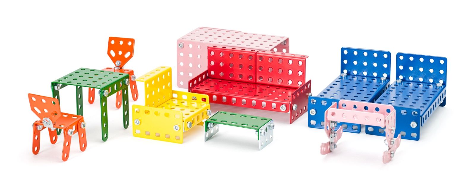 Stabil szék-, asztal-, ágy- és kanapémodellek perforált fémelemekből, amelyek bírják az intenzív játékot és újra meg újra összerakhatók.