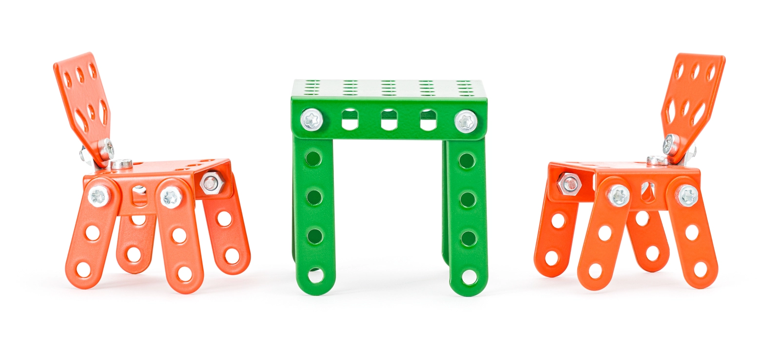 A MERKUR fém építőkészlettel a gyerekek könnyedén állíthatnak össze élethű babaházbútorokat. A masszív fémelemek csavarokkal és anyákkal rögzíthetők, így a modellek tartják a formájukat, stabilak, és újra meg újra átépíthetők. A vidám színeknek és az univerzális perforált elemeknek köszönhetően tucatnyi variáció készülhet a fantázia szerint.