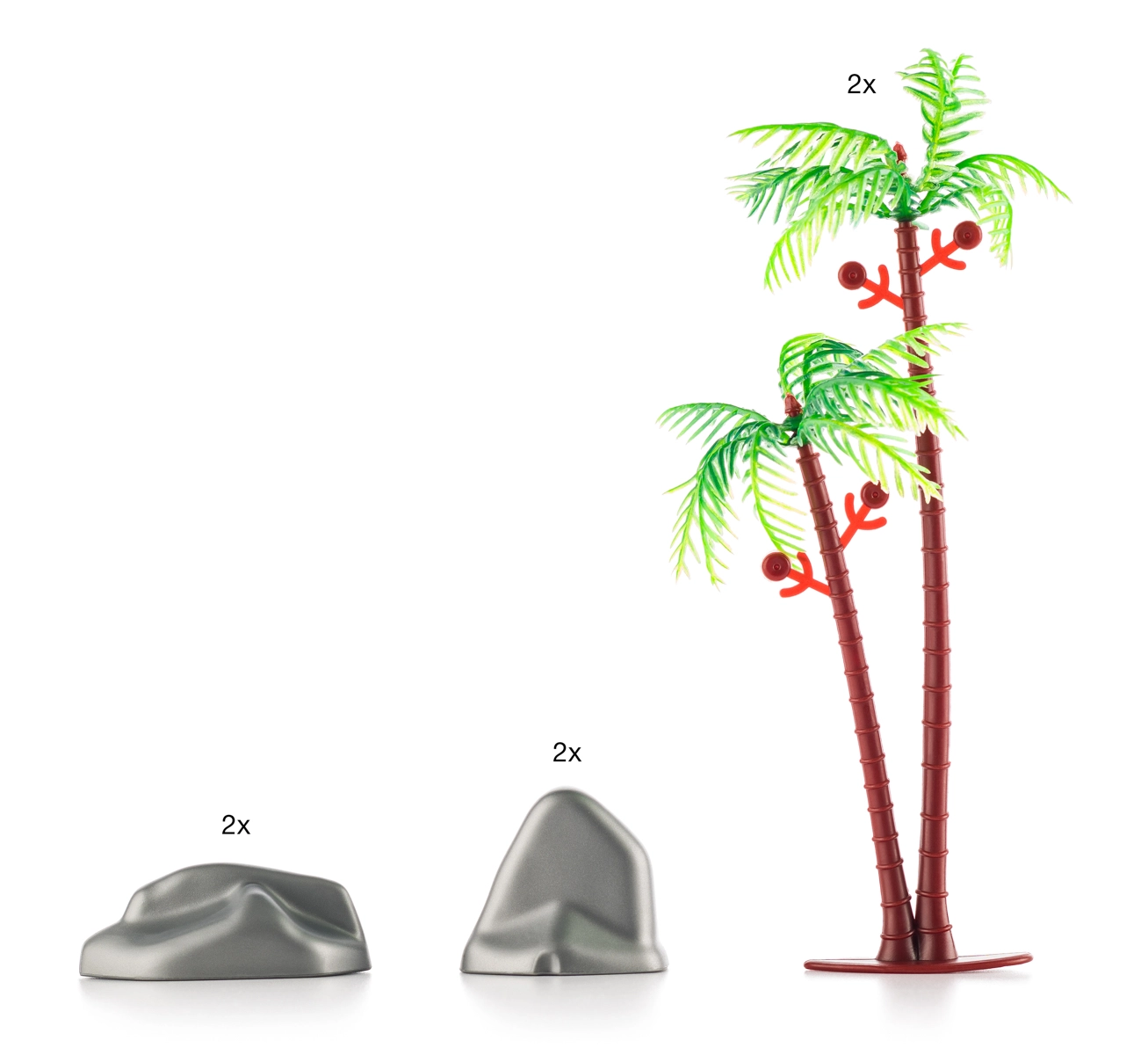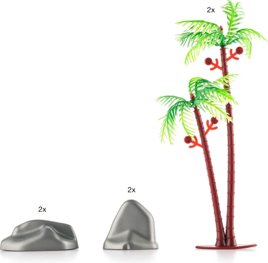 - 1× dínófej, 3× dinoszaurusz 11–16 cm, 3× dinoszaurusz 10–14 cm, 12× dinoszaurusz kb. 5 cm, 4× sziklaelem, 2× fa