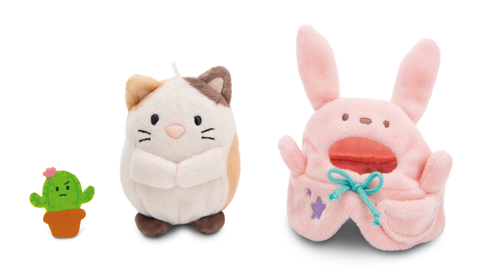 Teljes mini készlet játékhoz és gyűjtéshez: Angy cica, plüss kaktusz és bolyhos, rózsaszín jelmez nyuszifülekkel és csillagokkal.