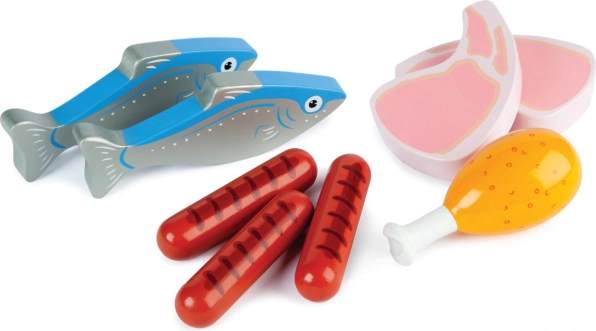 Friss hús és hal kiszállítása fa dobozban fogantyúkkal. Remek játék a boltosdit vagy szakácsosdit játszó gyerekeknek; a készlet 2 halat, 2 szelet húst, 3 kolbászt és 1 csirkecombot tartalmaz. Kiváló módja annak, hogy a gyerekeket megtanítsuk az egészséges és kiegyensúlyozott táplálkozás fontosságára, valamint arra, honnan származik az étel és hogyan kell elkészíteni. Minden darab tömzsi kialakítású, ideális a kis gyermekkezekhez. Támogatja a kreatív és képzeletbeli játékot. Felelős forrásból származó, minőségi anyagokból készült. Megfelel az európai biztonsági szabványnak. Fő jellemzők: ideális forma a kis gyermekkezek számára, fejleszti a kreativitást és a képzelőerőt