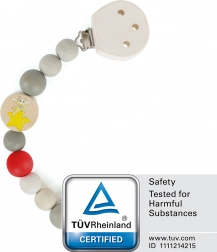 A praktikus klipsznek köszönhetően a cumi könnyen rögzíthető a ruházathoz, a babakocsihoz vagy az autósüléshez, így nem esik a földre és nem tűnik el. A természetes, finom színárnyalatú fa gyöngyök kellemesek a baba kezének és szemének, és segítik az érzékszervi fejlődést.