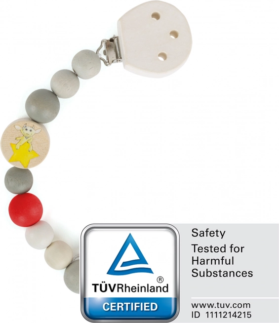 Stílusos és biztonságos fa cumitartó klipsz a small foot Ludwig márkától, amely a cumit mindig kéznél és tisztán tartja. Nyálálló, kellemes tapintású, változatos formái és gyöngyei pedig támogatják a finommotorika fejlődését és serkentik a babák kíváncsiságát. Magas minőségű, káros anyagoktól mentes fából készült.