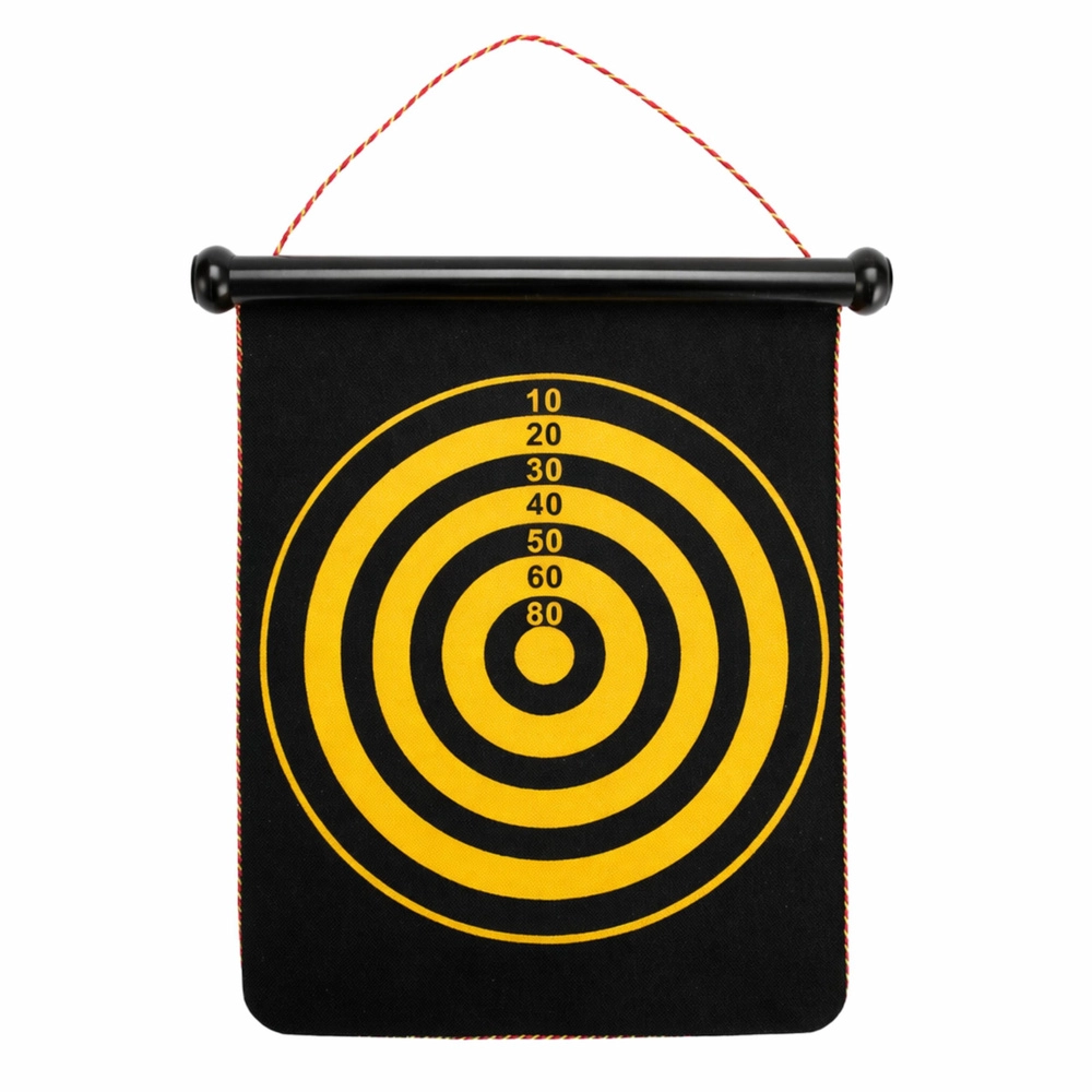Ideális kezdőknek és haladóknak: az egyik oldal standard pontozott céltáblát kínál, a másik célzóköröket a gyakorláshoz. A nyilak színkódolása (piros és sárga) tisztességes párbajt tesz lehetővé párosban vagy csapatban. A mágnesek erősen tartanak a felületen, de nem károsítják a bútorokat.