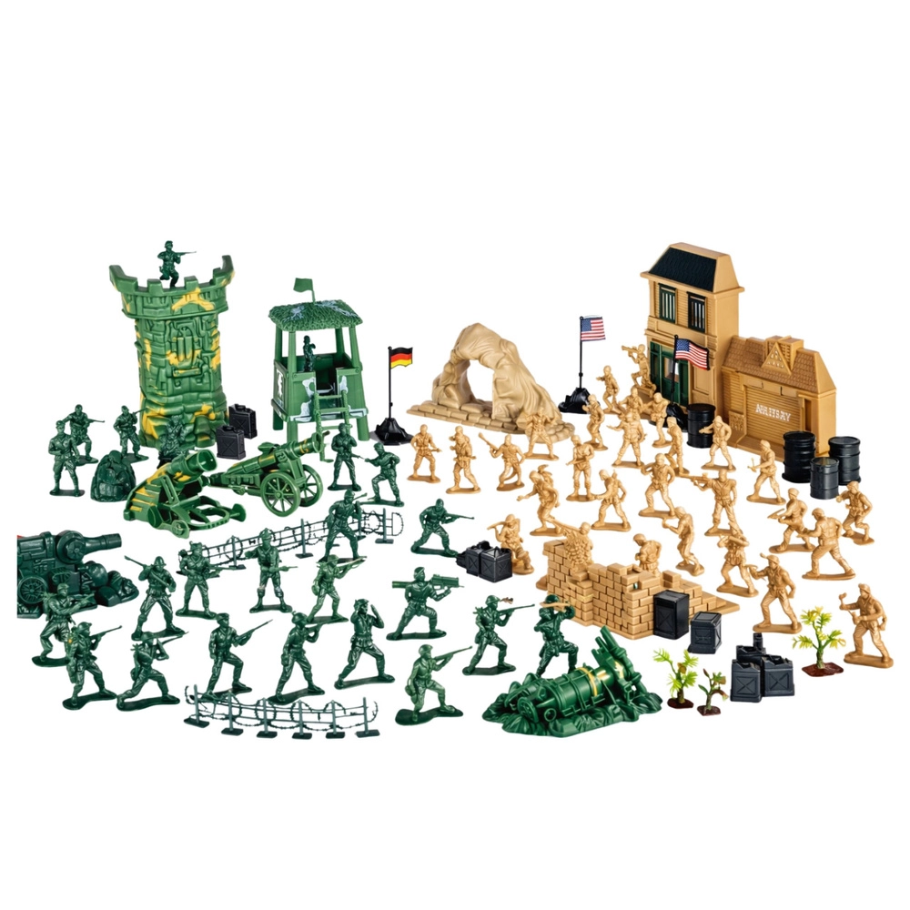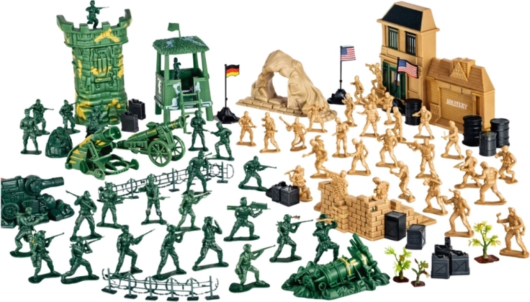 - Sokféle figura és kiegészítő: katonák, járművek, ágyúk, fegyverek, akadályok, zászlók, kerítések