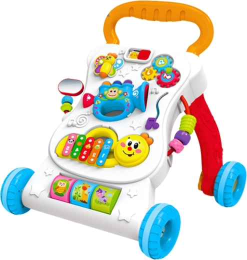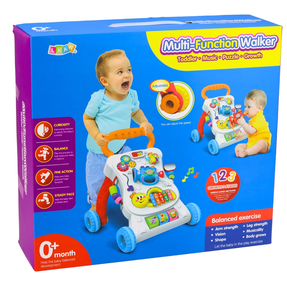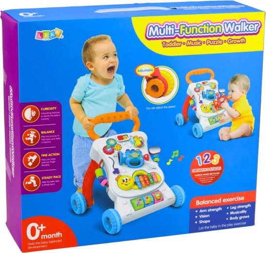 A multifunkciós, interaktív 3 az 1-ben járássegítő már az első hónapoktól segíti a gyermekeket a motorika és az érzékelés fejlesztésében. A tolójárássegítő funkciónak köszönhetően a gyermek biztonságosan gyakorolja az egyensúlyt, miközben a színes panel zenei elemeket, gombokat, mozgó részeket és egyszerű kirakókat kínál. A stabil kialakítás, a keréksebesség-szabályozás és a kényelmes fogantyú biztonságos és szórakoztató járástanulást biztosít.