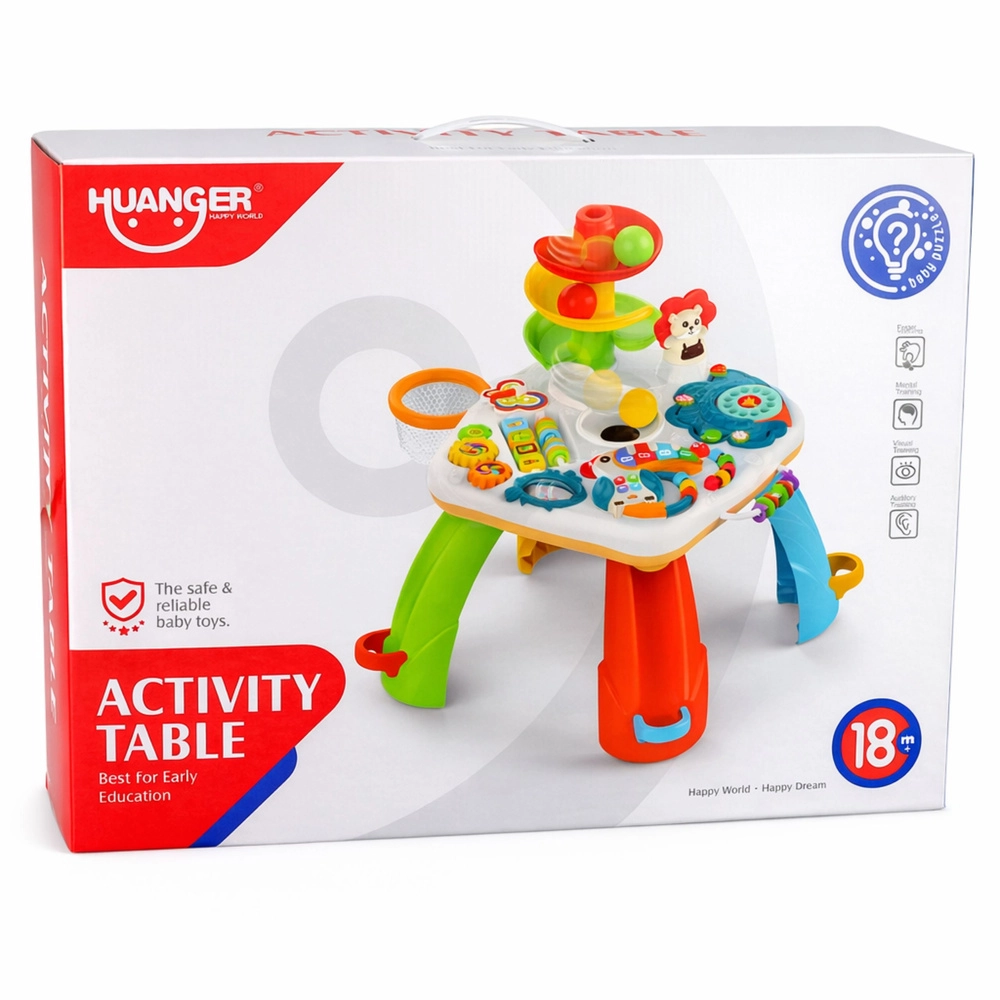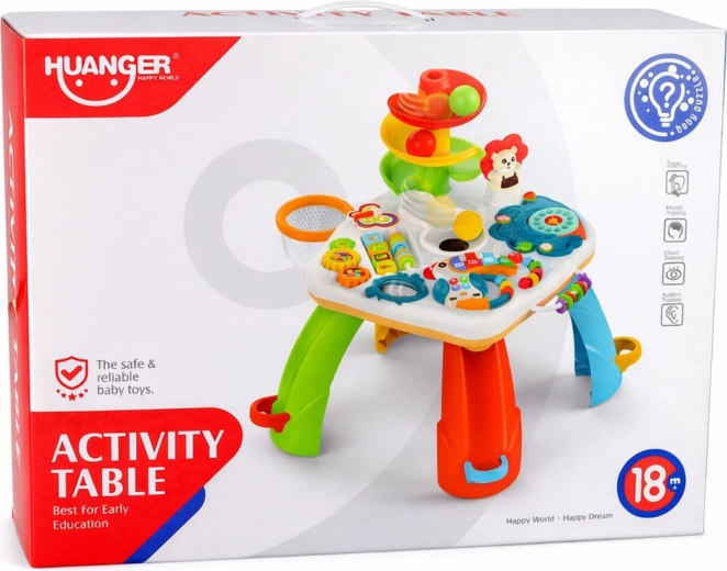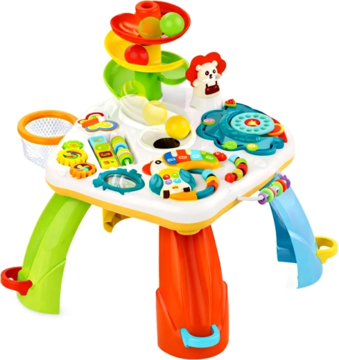 Az interaktív tanulóasztal a legkisebbeknek egyesíti a tanulást és a szórakozást. Kínál egy színes zongorát dallamokkal, egy labdacsúszdát, mozgó elemeket, valamint fény- és hangeffekteket, amelyek fejlesztik a finommotorikát, a koordinációt, valamint a színek és formák érzékelését.