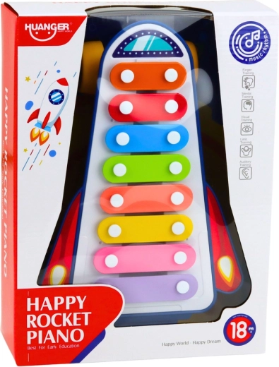 A rakéta alakú gyermek xilofon zongorácska ideális első hangszer a legkisebbeknek. A színes, hangolt lamellák kellemes hangokat adnak, segítenek a színek és a ritmus tanulásában. A mellékelt ütő támogatja a kéz pontos mozgását és természetesen fejleszti a finommotorikát.