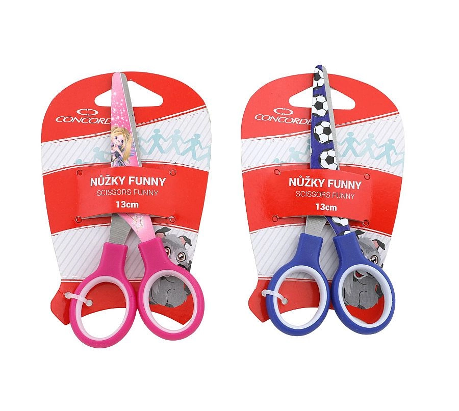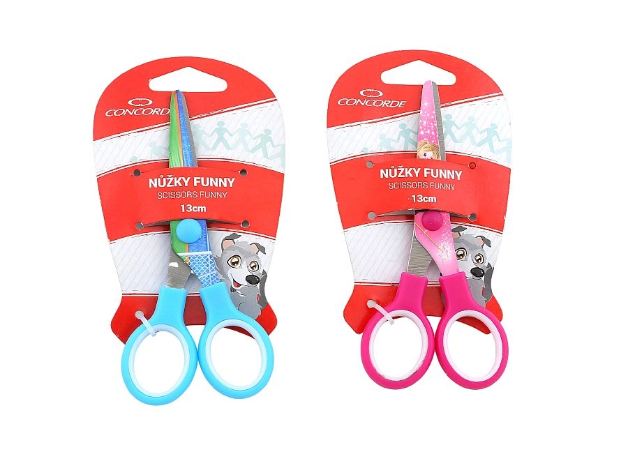 A CONCORDE Funny 13 cm hosszú, biztonságos és játékos iskolai olló vidám, rózsaszín vagy kék mintával örvendezteti meg a gyerekeket. Lekerekített hegyekkel a biztonságos vágásért, széles ergonomikus fogással a kényelmes tartásért és könnyű járással a papír és kreatív anyagok egyszerű vágásához.