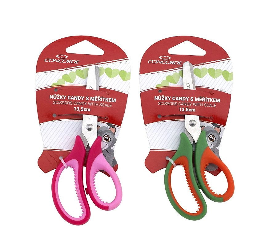 A CONCORDE Candy iskolai olló 13,5 cm hosszúságban ideális gyerekeknek és otthoni használatra. Beépített skálát, kényelmes, széles fogást és színes mintát kínál rózsaszín vagy zöld változatban. Bliszteren szállítva az egyszerű és biztonságos tárolásért.