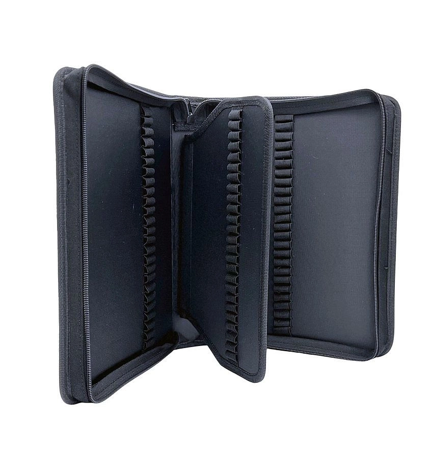 A bal oldalon 25 rögzítő található, a belső fedélrész 2 × 25 rögzítőt biztosít (a fedél mindkét oldalán), a jobb oldal pedig további 25 rögzítőt ad hozzá. A megbízható cipzáras záródás biztonságban tartja a tartalmat szállítás és prezentáció közben.