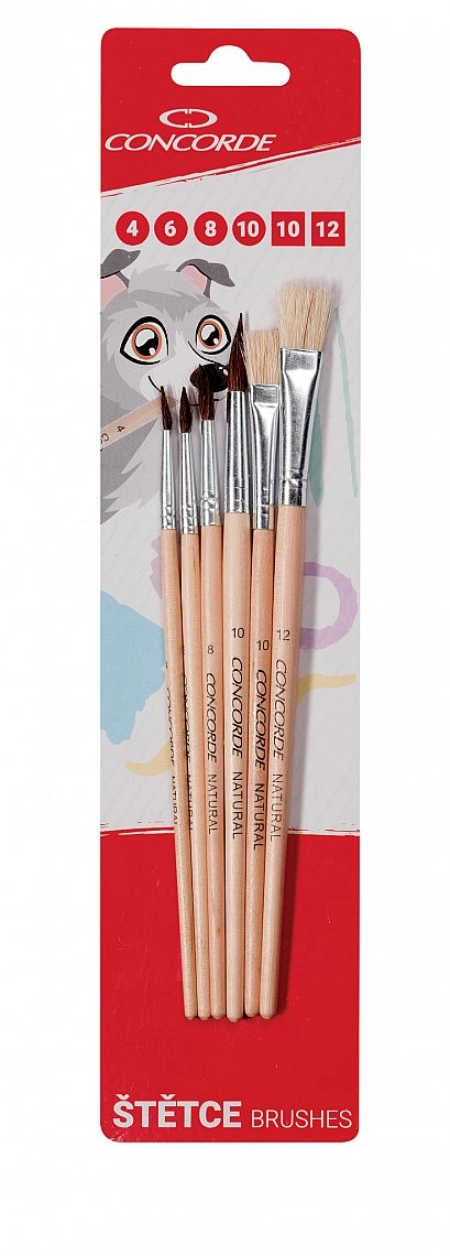 Univerzális CONCORDE ecsetkészlet iskolába, hobbira és műhelybe, összesen 6 darabbal – kerek szőr ecsetek sz. 4, 6, 8, 10 és lapos sörte ecsetek sz. 10, 12. A természetes szálaknak és a lakkozott fa nyélnek köszönhetően kényelmes fogást biztosít, valamint pontos munkát és hosszú élettartamot. Csomagolás praktikus bliszteren az egyszerű tároláshoz.